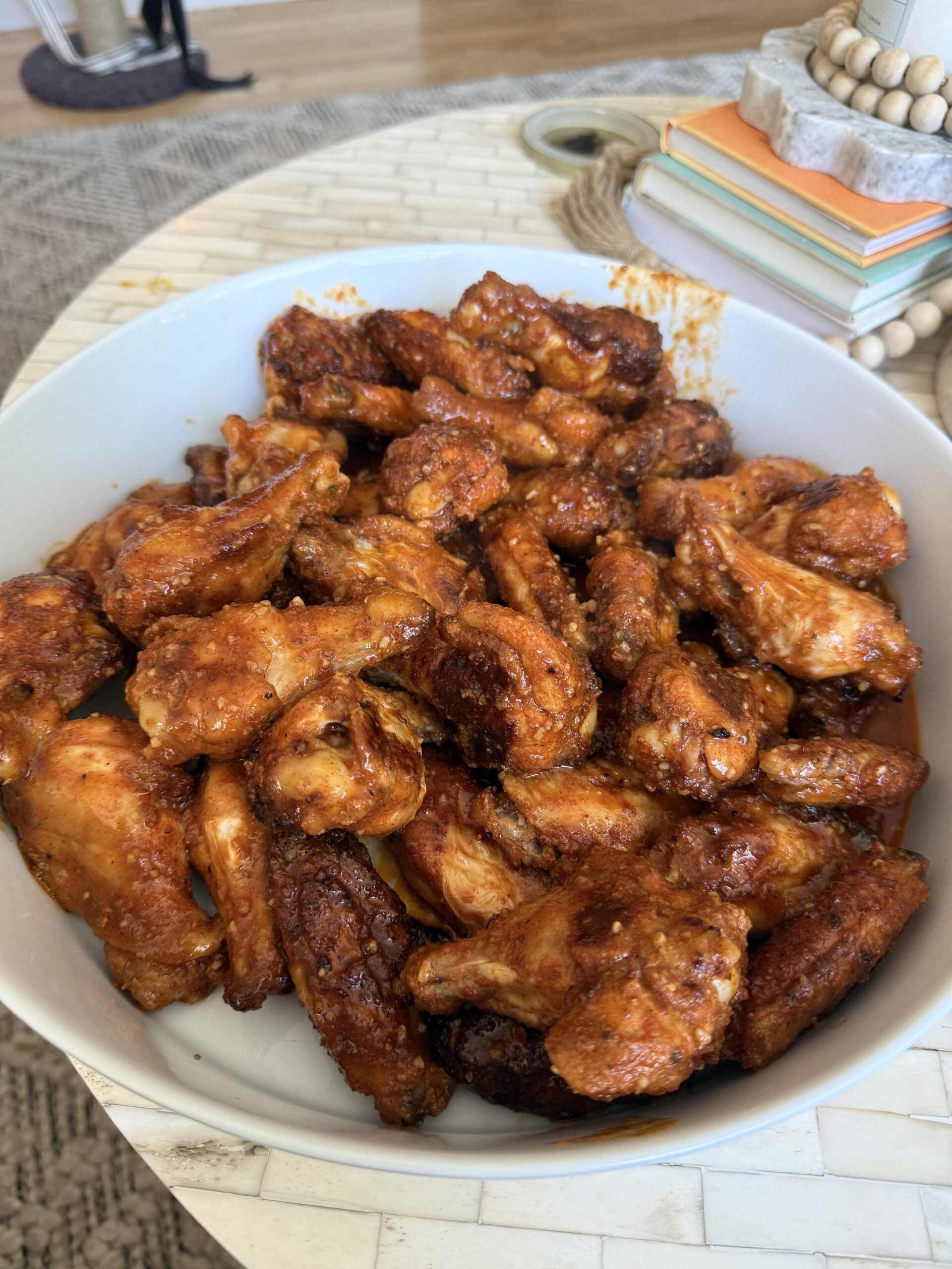 4lbs. Dry rub, smoked for an hour, finished on the grill, tossed in homemade sauce.