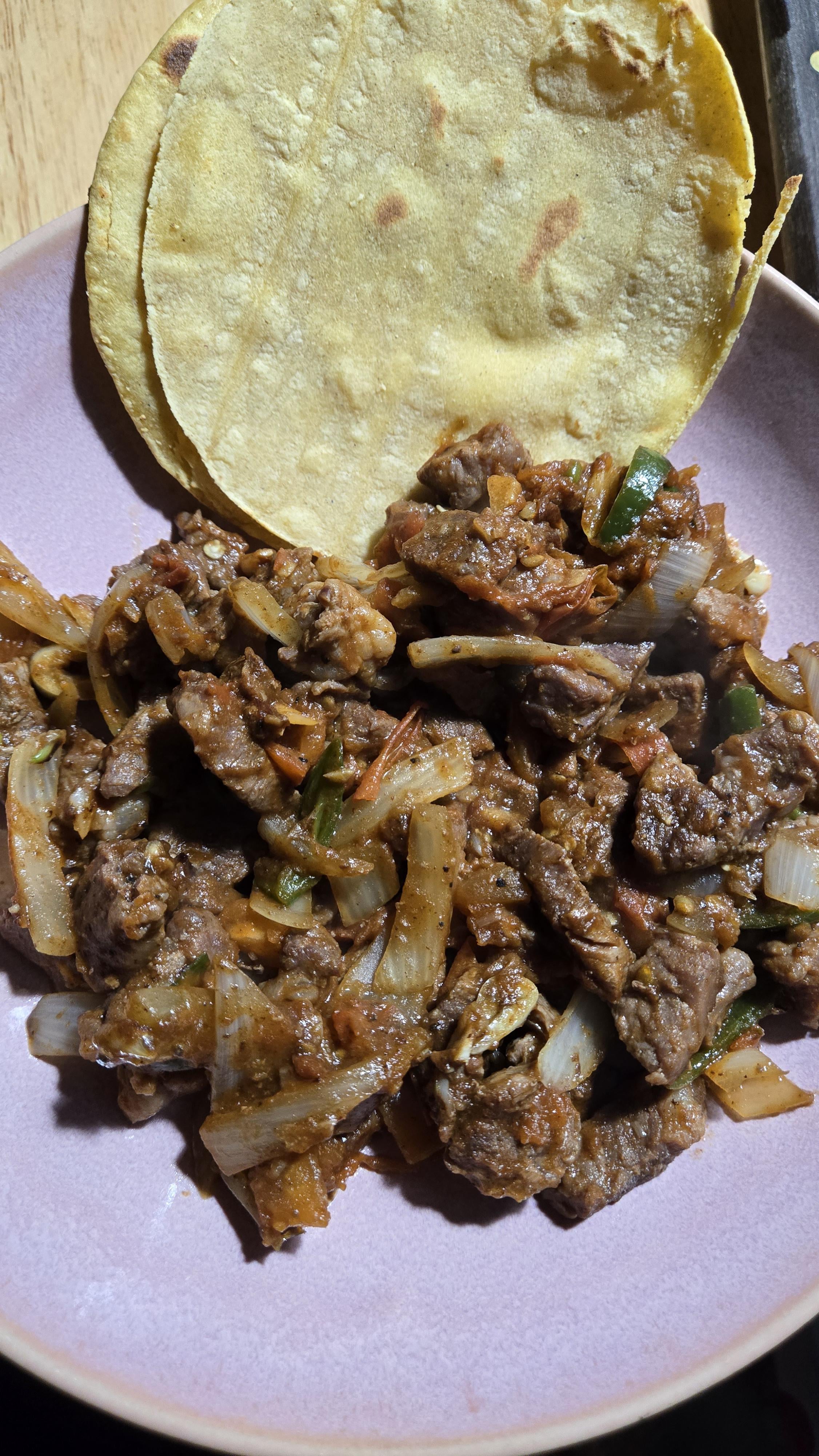 Steak agujas cut up with tomato, onion, serrano, garlic, salt and pepper.