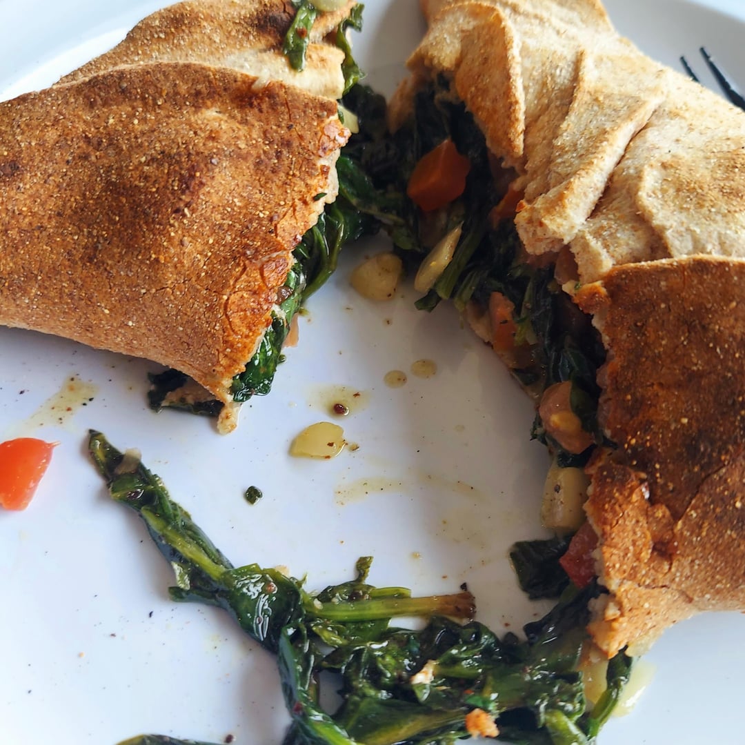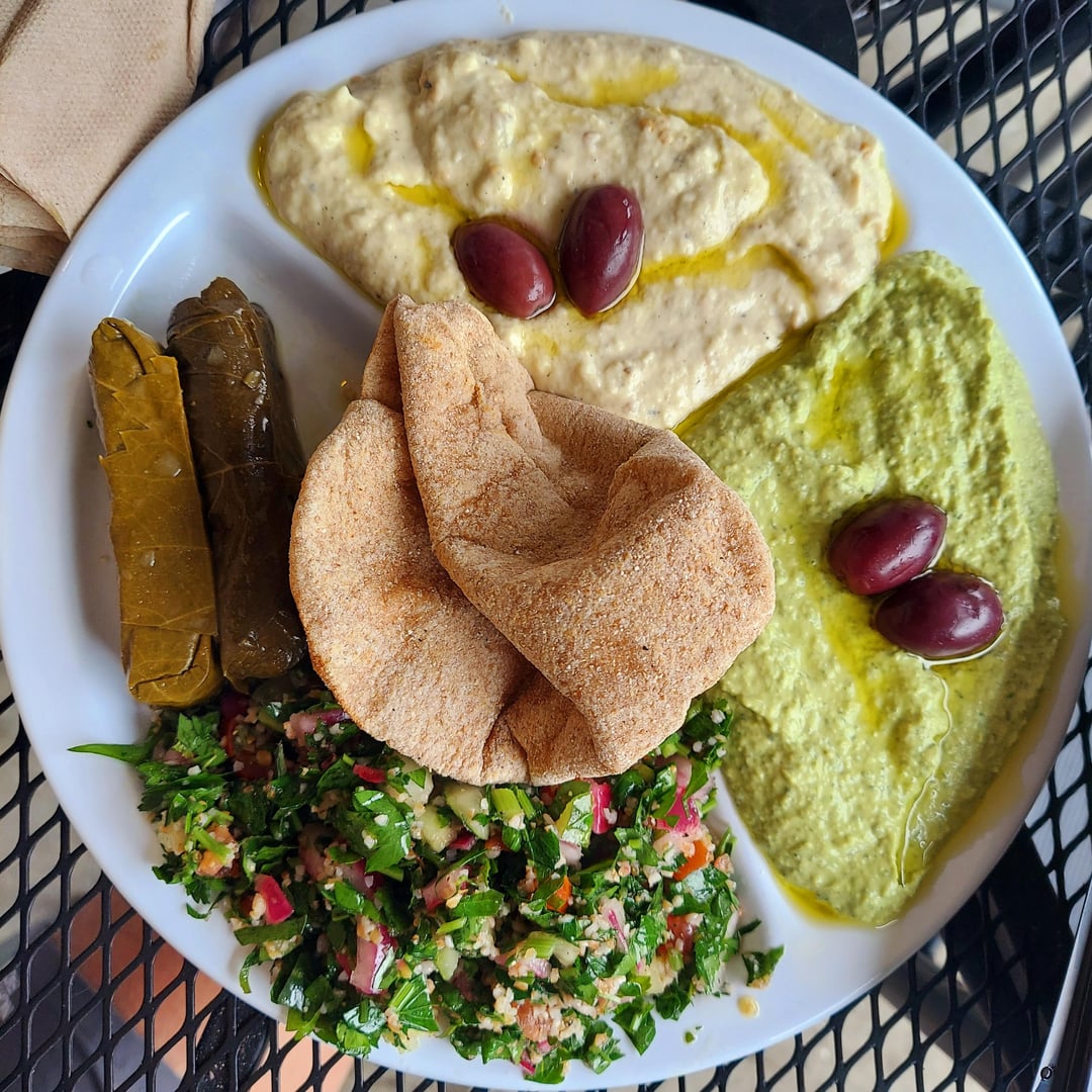 Tabouli, jalapeno-cilantro hummus, baba ghanouj, stuffed grape leaves and pita bread
