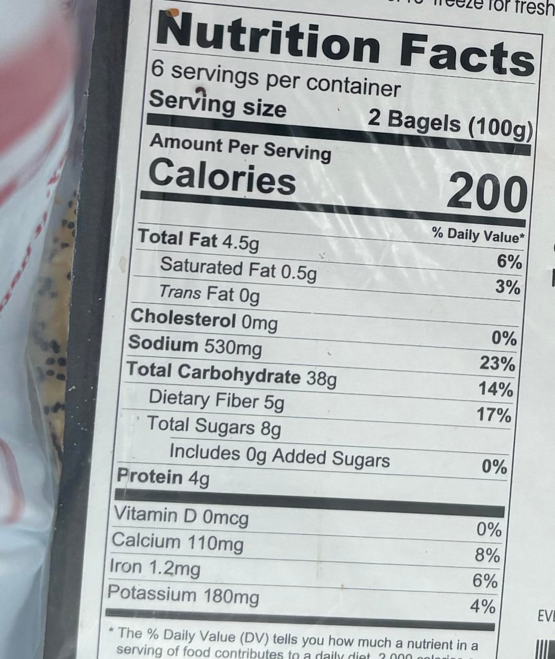 package says 100 cals and includes 6 bagels, nutrition label says 200 cals per serving and serving is 2 bagels, but says 6 servings per container???? can someone help 😭