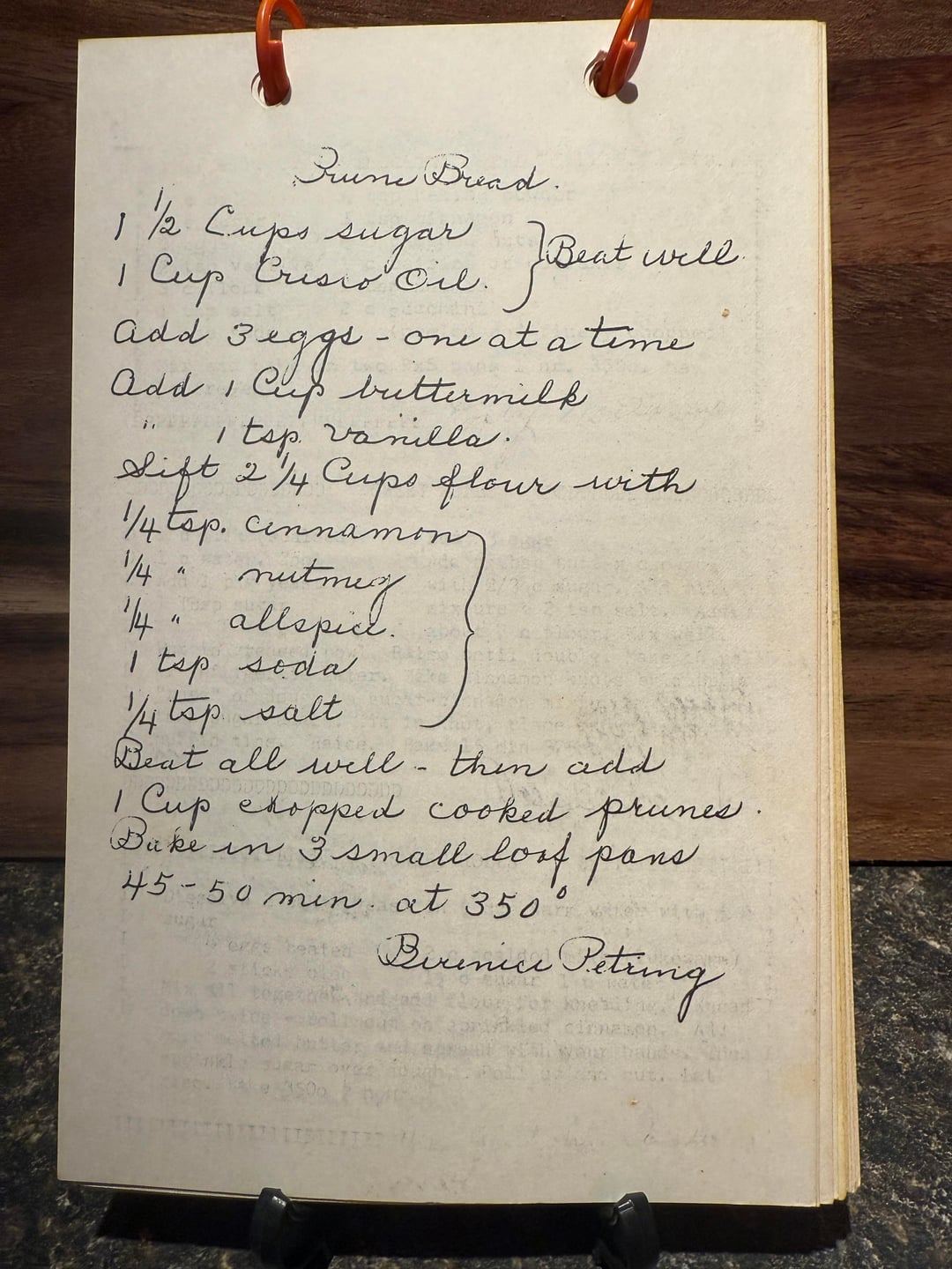 Beat all well – then add 1 cup chopped cooked prunes. Bake in 3 small loaf pans 45-50 min at 350 degrees.