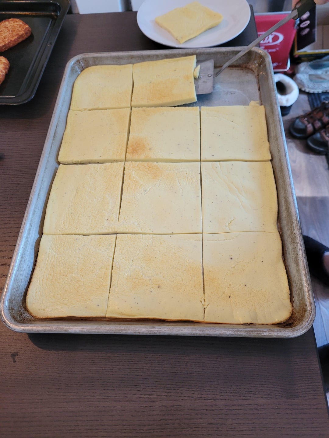 I use sheet pan baked eggs instead of scrambled (1C cottage cheese, 12 eggs, s&p to taste, mix with immersion blender, pour into rimmed cookie sheet,bake @ 350 for about 15 min). Cut into squares and use 2 per large tortilla.