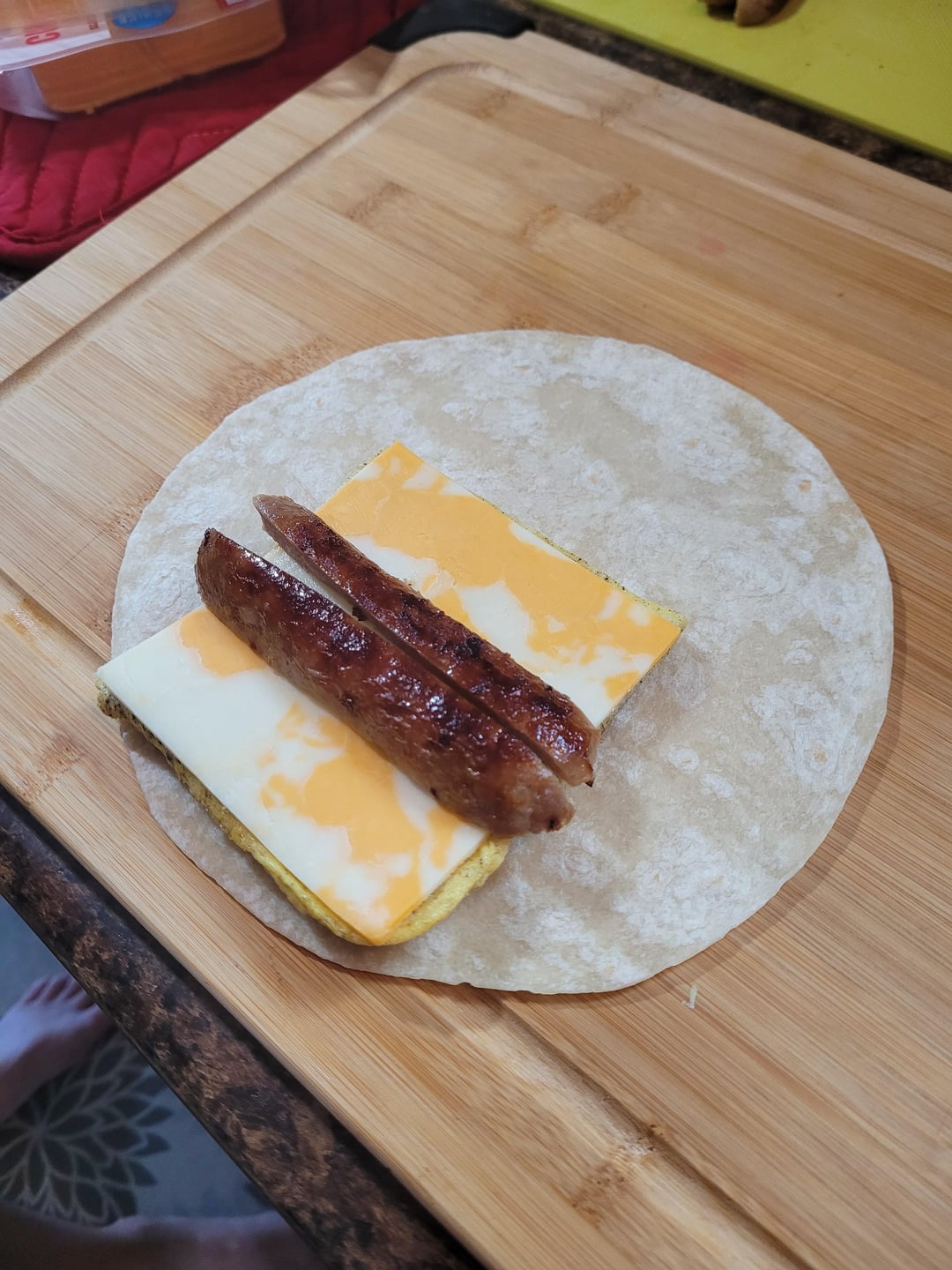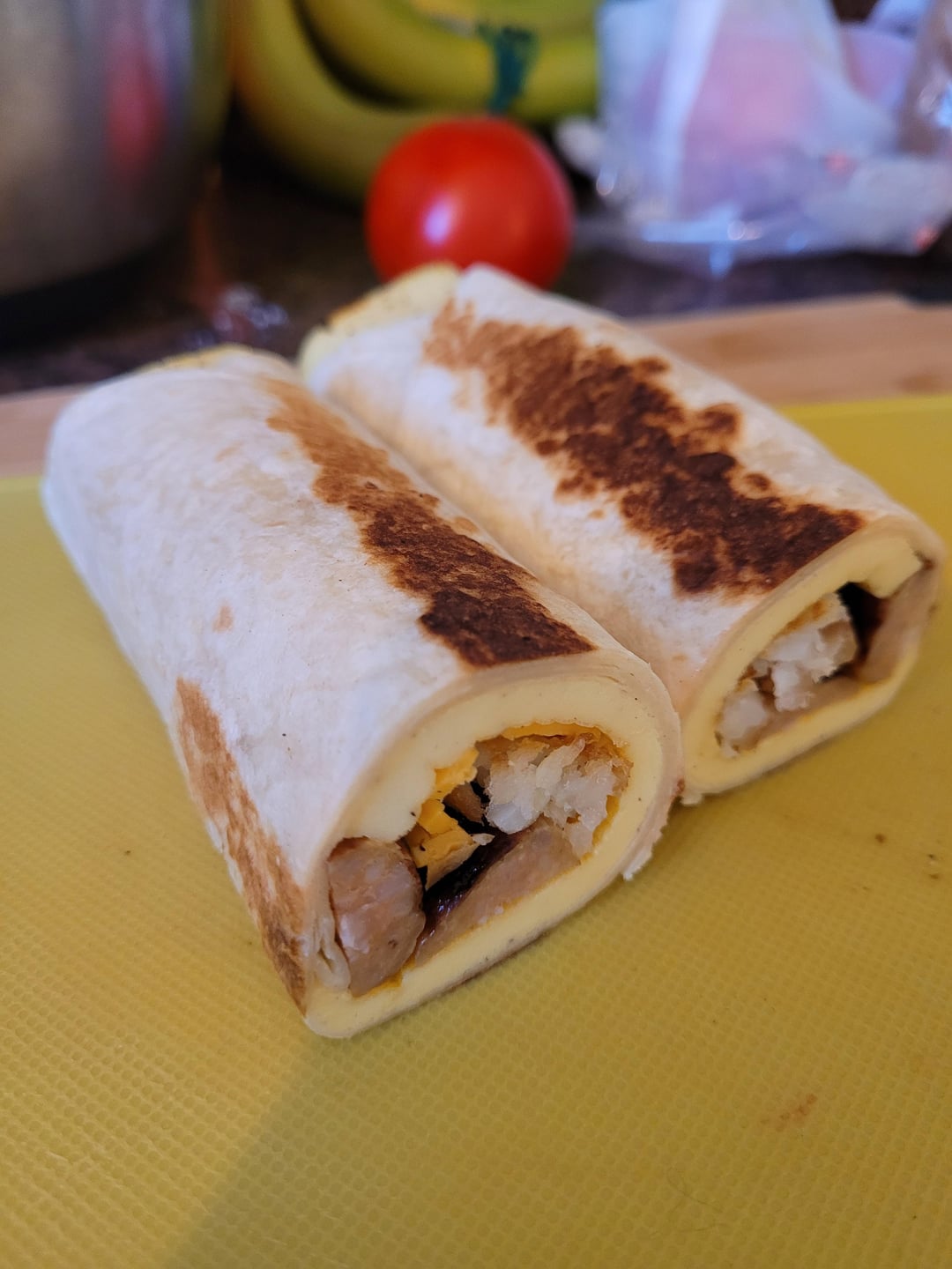 Layer egg & cheese, top with sausage and potato slices, roll, then sear in a dry cast-iron to close them up. Let cool then cut in half and wrap in wax paper. Microwave for 30-40 sec and eat from the cut end. All the goodness of a breakfast burrito without my awkward mess! Makes more than enough for 2 of us for the week.