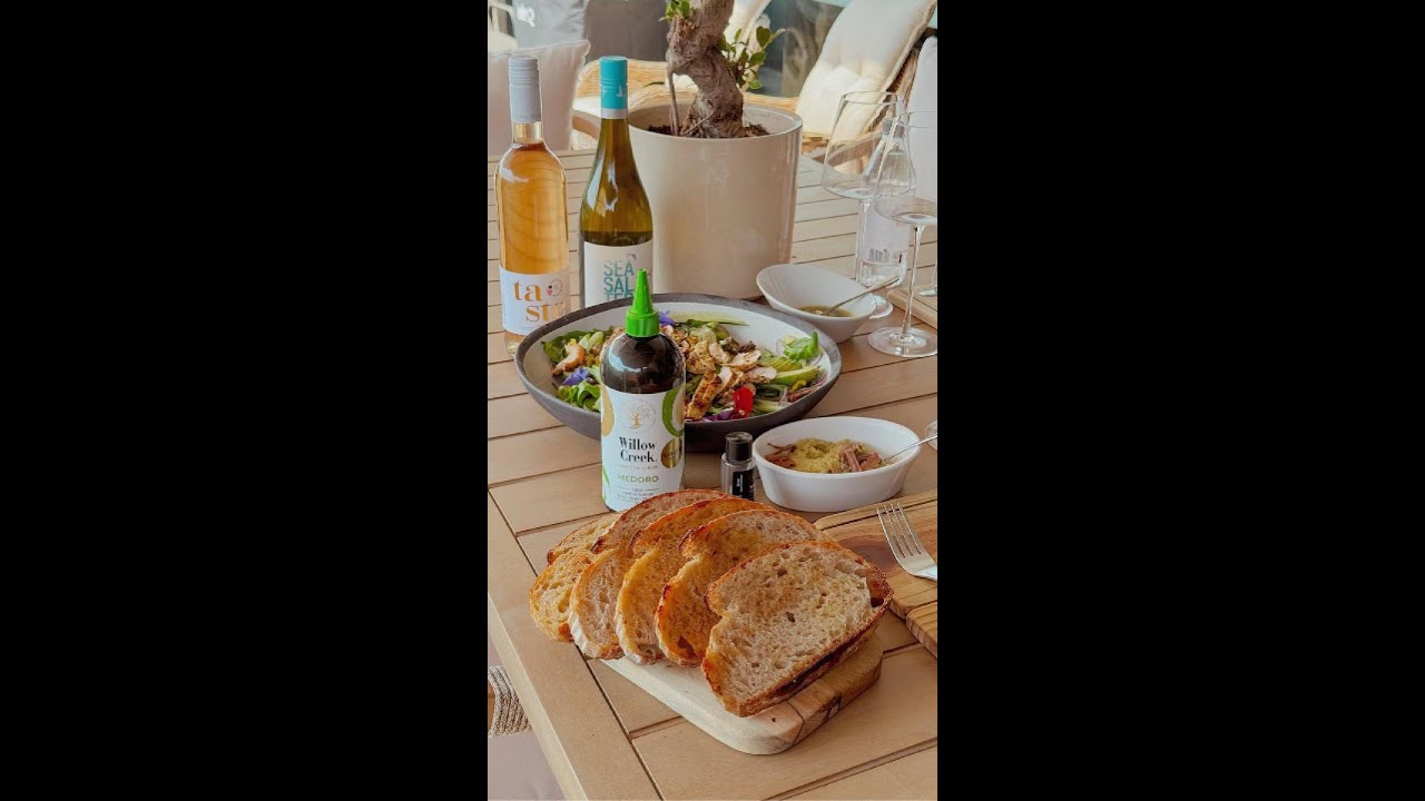 Hi guys, my name is Chef Franco from Chef and Guests and we received a wonderful little goodie bag from our friends at Willow Creek and we decided that we’re going to use their 100% Madora Mediterranean olive oil to create a few little goodies that we have in front of you. So, being spring and going into the warmer season of the year, we decided to do a little fresh grilled chicken salad. And we also got some beautiful green olives which we made into this awesome little tapernade. And I’ll get into the processes of that now. So what we have is a sourdough bread which we just lightly pan seared in a little bit of butter. And we did a little chicken breast. So here with a little Mediterranean, some garlic, parsley, few capers for a little bit of acidity and just pan seared it very nicely for you guys. For our taponad, what we did is de seeded our olives one by one, which takes a few minutes, and then blending that in a food processor, little bit of the madera olive oil, salt, pepper, and just getting it into a nice smooth texture almost similar to peanut butter, and then just topped it with a bit of anchovies for a little bit of saltiness. We’ve also made a very nice little marination of your extra virgin olive oil. We have some grated Parmesan cheese, a little bit of balsamic with just a hint of touch of chili flakes on top, which will be our wonderful dipping for the bread. And we’re just going to assembly a very vibrant, light, crispy salad with a few ingredients. We have here some rocket, some parsley, little bit of basil, some green lettuce, as well as some exotic cherry tomatoes, some sliced red onion, some julian ribbon style cucumber, and then we have wonderful fresh vibrant avocado. So, I’m going to get assembling that for you and put everything together. We’ll also be pairing these today for our tapernut is going to go fantastic with this sea cell sea salt savon blanc and our chicken salad will be prepared or shared together with these rosé from family wines. So this is going to be your first taste for us today. Right. So the basis of a salad is you want to get your lettuce and greens on the bottom and build up. So we do things very rustic. Just rip it apart. This is sharing. We just want everyone to get a little taste of everything that’s in the plate. We’ve got our basil leaves. [Music] So, in layering, we’re going to do both of the olive oils. Just a little scatter. Few of the tomatoes on the side. [Music] And then with the ribbons, they’ve already been sliced, so you just break them apart in your hands. Right. [Music] Few more tomatoes on top. Now, what I like to do with my onions, just coat a little bit of olive oil onto the onions. Helps them break apart and fall apart on top. There we go. Scatter some of our micro greens. [Music] Now, before I add the final ingredients, I’m just going to give this a little toss through. [Music] Right. Twizzle of olive oil. [Music] Curly parsley fronds. [Music] Some very nice edible flowers. So everything in this bowl is edible. Beautiful vibrant colors reminding us of the summer to come. And I’m going to put one piece of avocado over there. Fan it out and another one on this side. Right. So, we have a little squeeze of lemon just for that. So, that just stops your avocado from going brown. [Music] Beautiful. [Music] and then the piesta hoses, the grilled chicken breasts, sliced. [Music] We just scatter that on top. We get a little bit of that sauce that was cooked in the pan with the fried capers, parsley, garlic, olive oil, [Music] and one last drizzle. There you have it. A fresh vibrant grilled chicken breast, summer salad with avocado and the most importantly the 100% Mediterranean Willow Creek Madora extravirgin olive oil. So we’ll be preparing that together for the tapernade with the sea salt. Pop that over there. and the salad will be going with the rosé. [Music] So, what I’ll just do for you is let me put some of this beautiful tap that we made onto the bread. [Music] There we go. You can never have too much. Fantastic. Few [Music] pieces of anchovi. [Music] Oh yes, that is a winner for me. [Music] Super salty anchovies with that moorishness of the ground up green olives pairs fantastically with this. What I’m going to do now, let’s have some of the salad. What do you guys think? I think that’s a good idea. Grab a knife and fork. [Music] Little bit of chicken breast, [Music] avocado. Little cherry tomato. [Music] Not just doing this on TV. This is really good. [Music] Again, guys, perfect pairing. Light, vibrant, seasoned well. But this tapernade and anchovies is my personal favorite. Salty, salty. And I think it’s going to pair fantastically with these two right here. Thank you very much, guys. [Music] [Music]