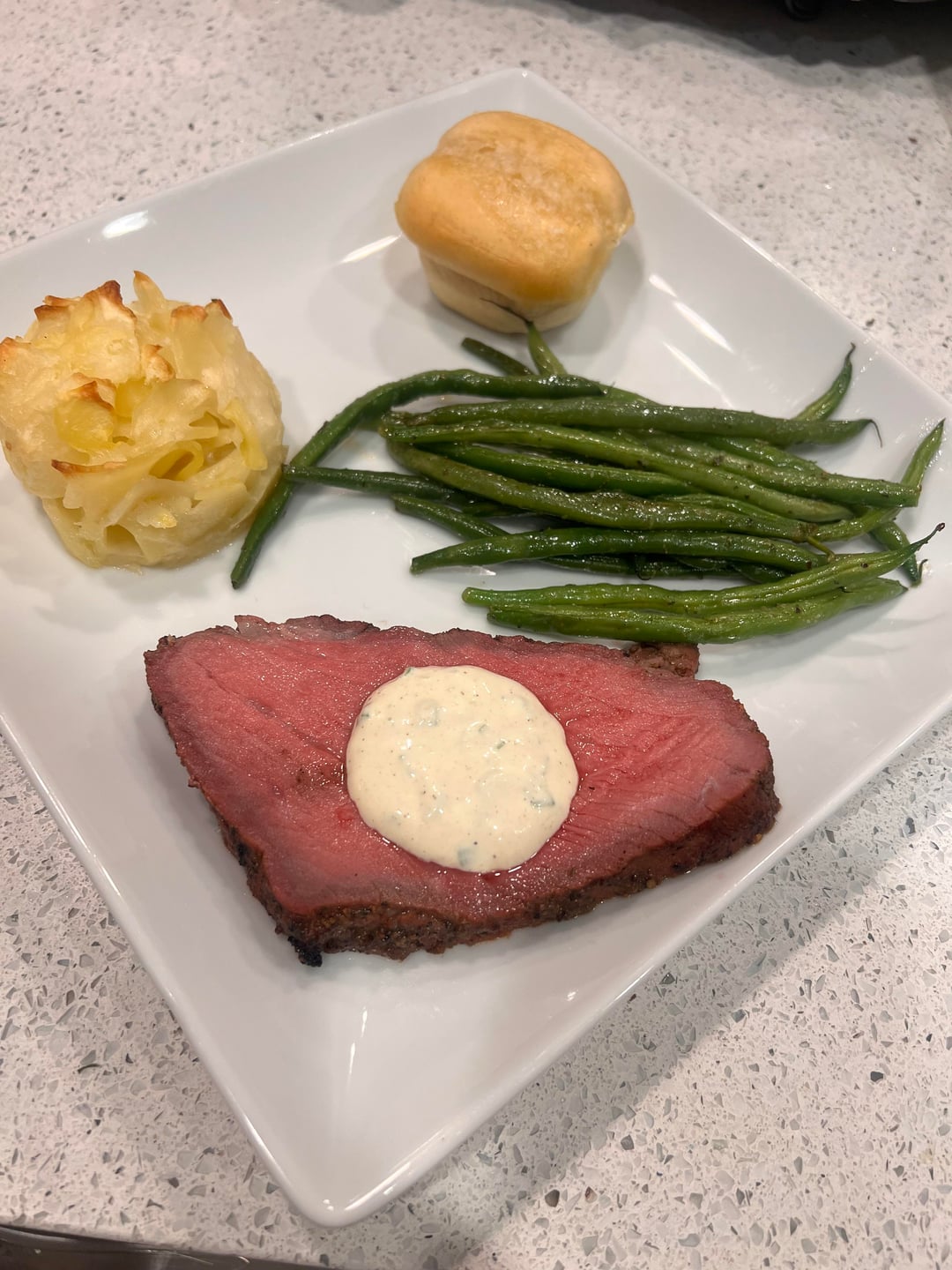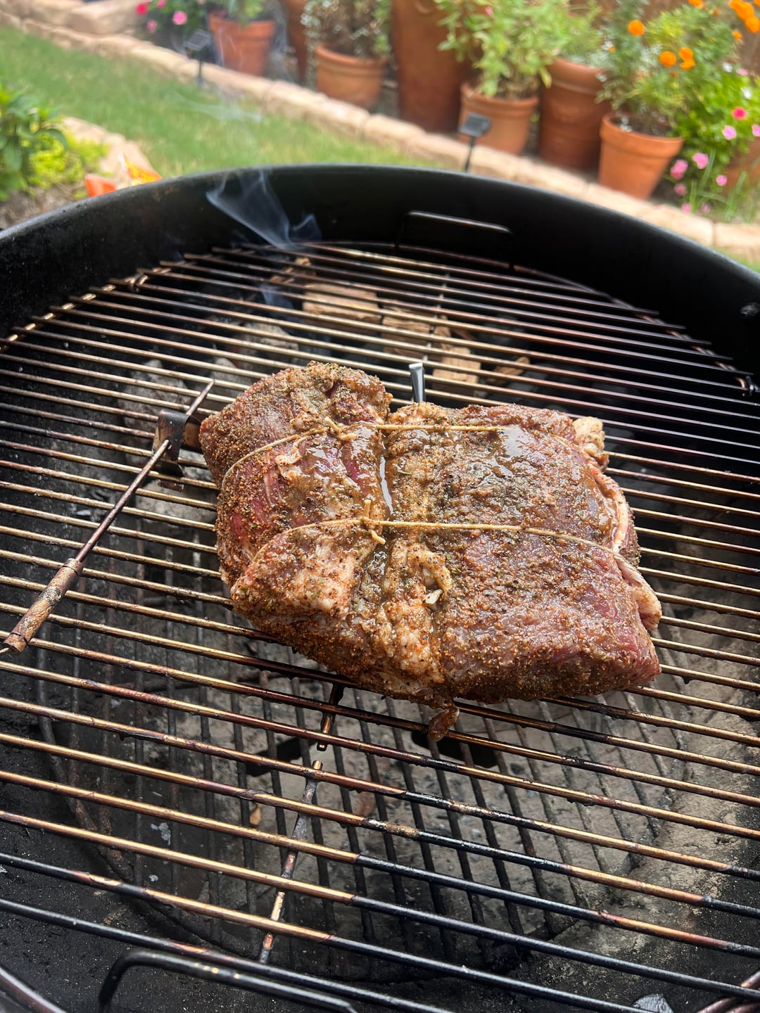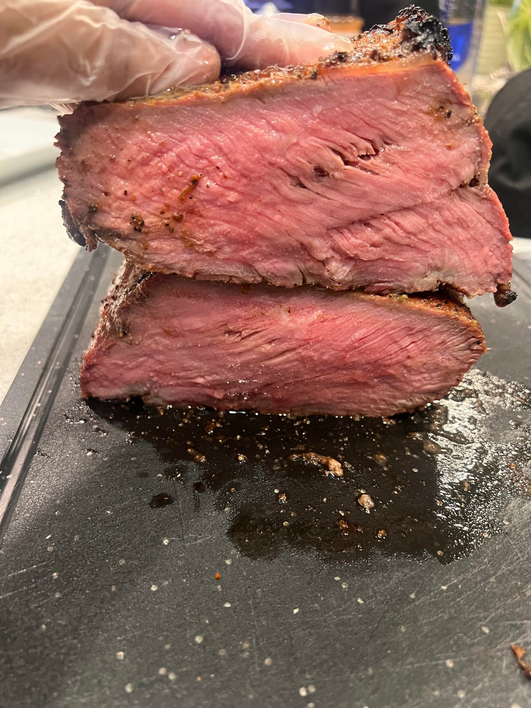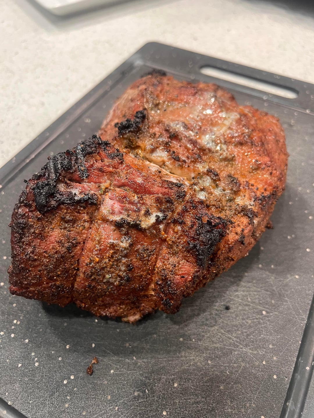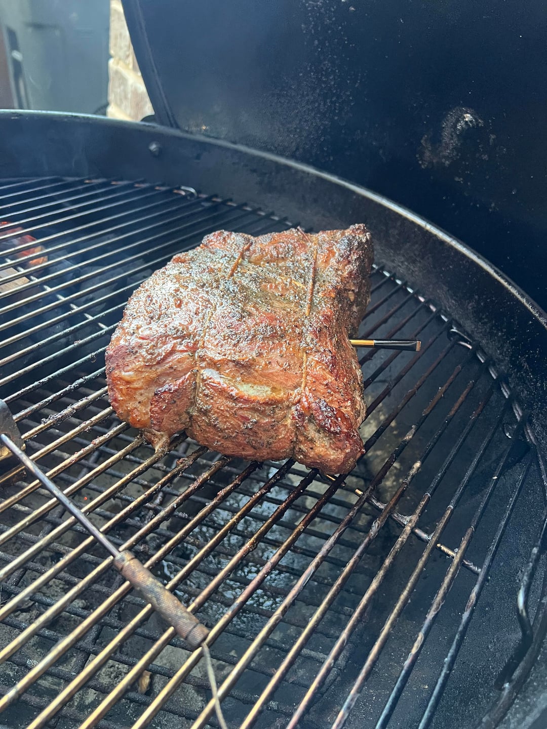 First time cooking prime rib. Started off with a 4lb Choice angus prime rib from Wild Fork. I did a 2 hour dry salt brine on it and then injected it with Wagyu tallow. Used Bear and Burton’s W sauce and a couple meat church seasonings. I smoked using the snake method and oak chunks. Pulled it at 125, rested it for 10 minutes while I combined all the remaining charcoal in a pile. After 10 minutes I put a nice char on it and then rested with a few pads of butter on top, tented with foil, for 30 minutes. The only thing I’d do differently is pull it at 120 next time. Otherwise, a success!