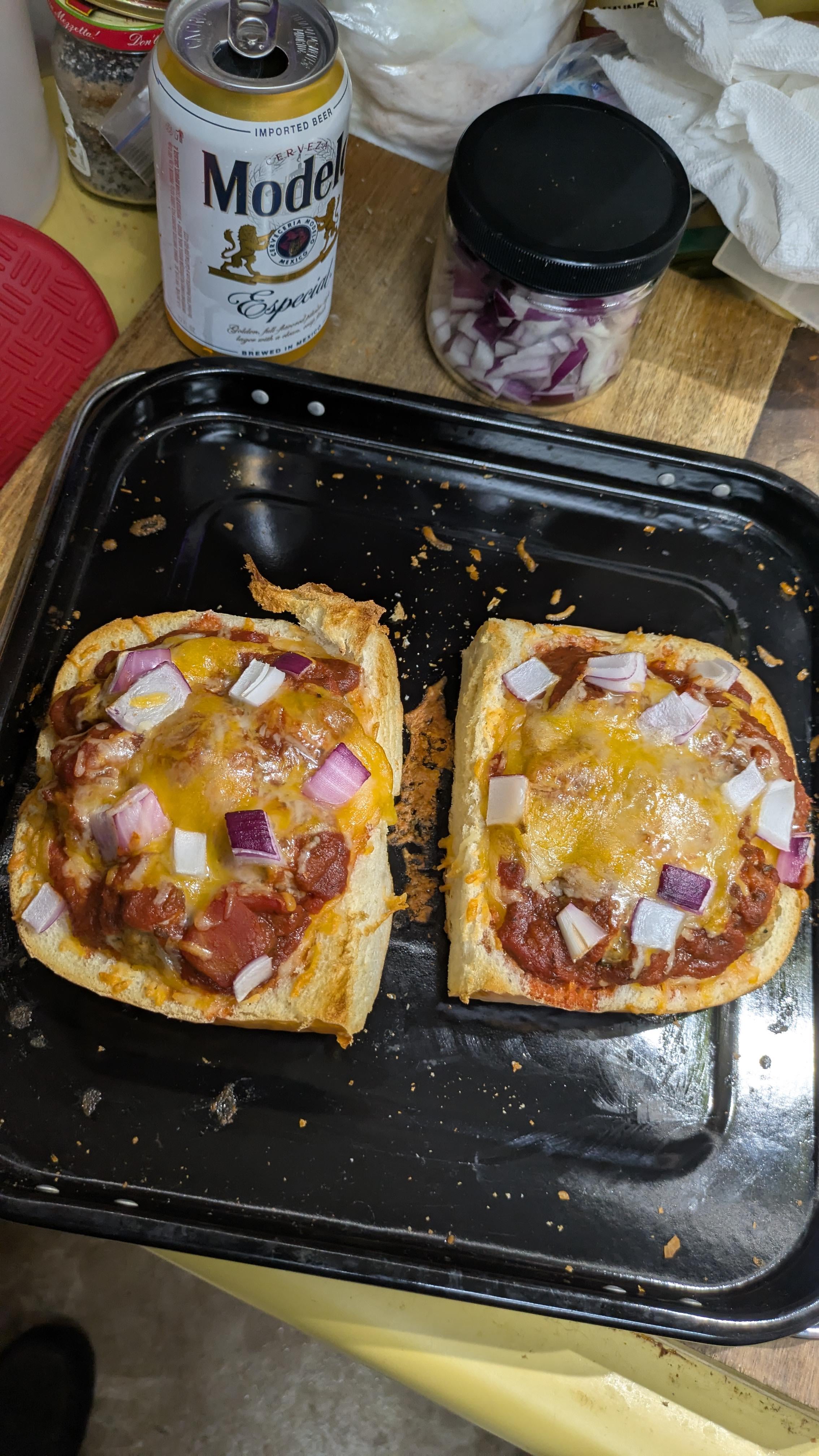 Two refrigerators and a big chest freezer all jammed full, but no pepperoni and no grated mozzarella, so I made due with Italian bread and Mexican cheese blend from Walmart, leftover pasta sauce and frozen meatballs from Aldi, beer from Mexico, and a purple onion that was getting old.