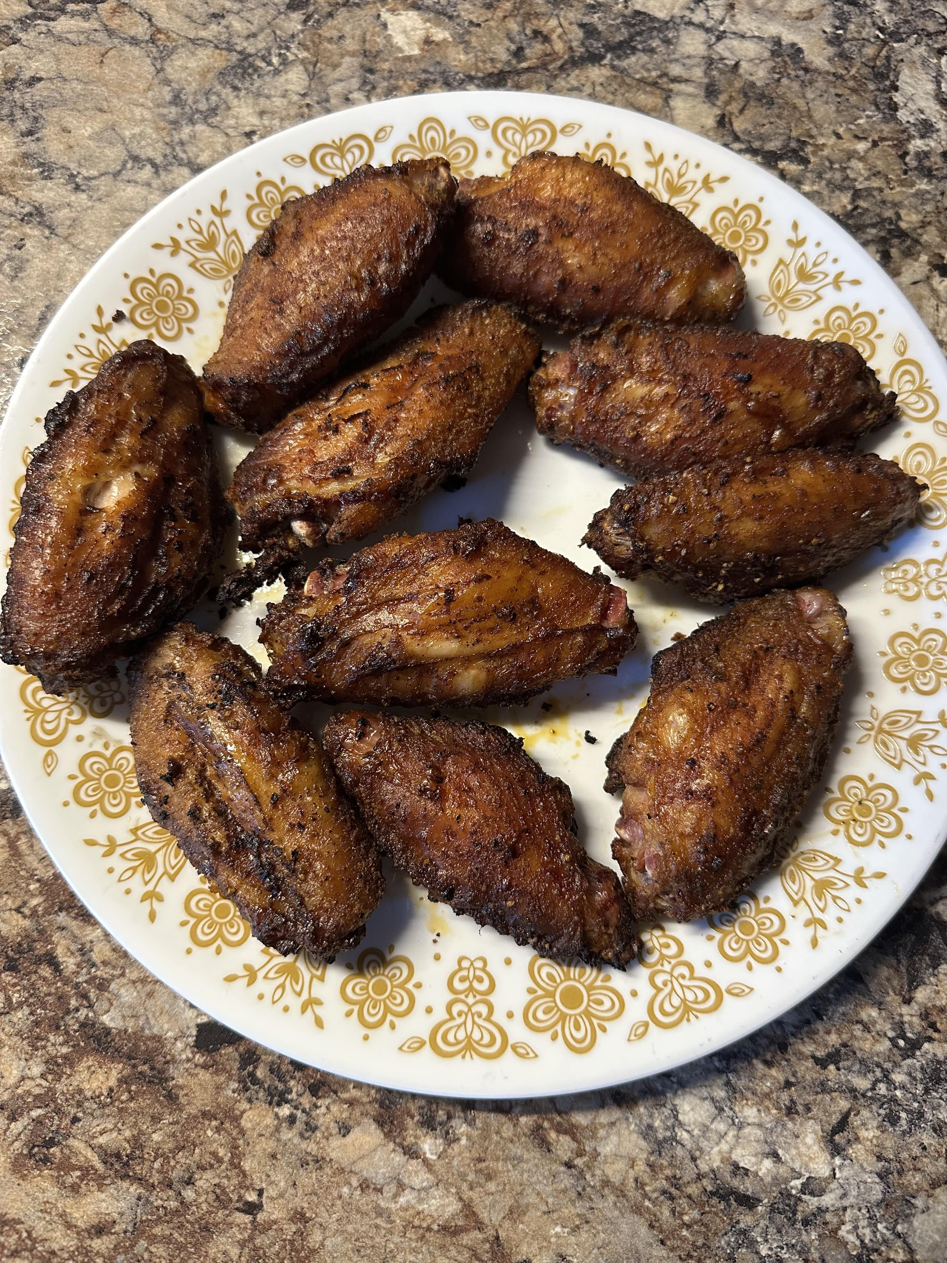 Smoked these wings with hickory pellets at 250 for 50 mins then turned it up to 350 for another 30 minutes. Seasoned them with MeatChurch Holy Voodoo and Texas Sugar. These came out so good. If you can’t tell flats are superiorby Odins_Eye33 2 Comments TiredReader87 6 months ago My Nana and Papa had those plates IZZO79 6 months ago No sides?