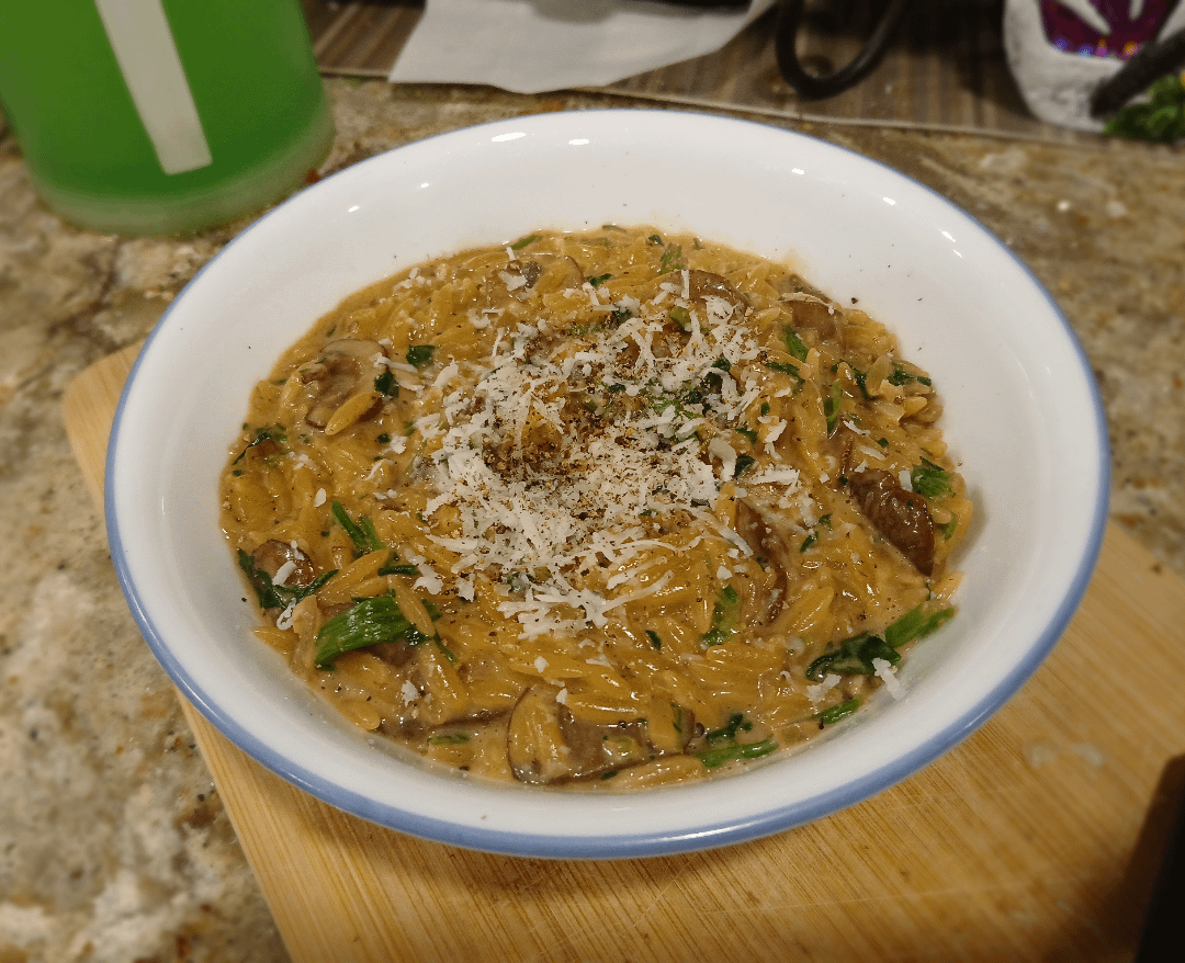 The household bought way too much orzo, so I got whiskey drunk and made something with it. Creamy spinach mushroom orzo. Enjoy! by ChaserOfThunder Dining and Cooking