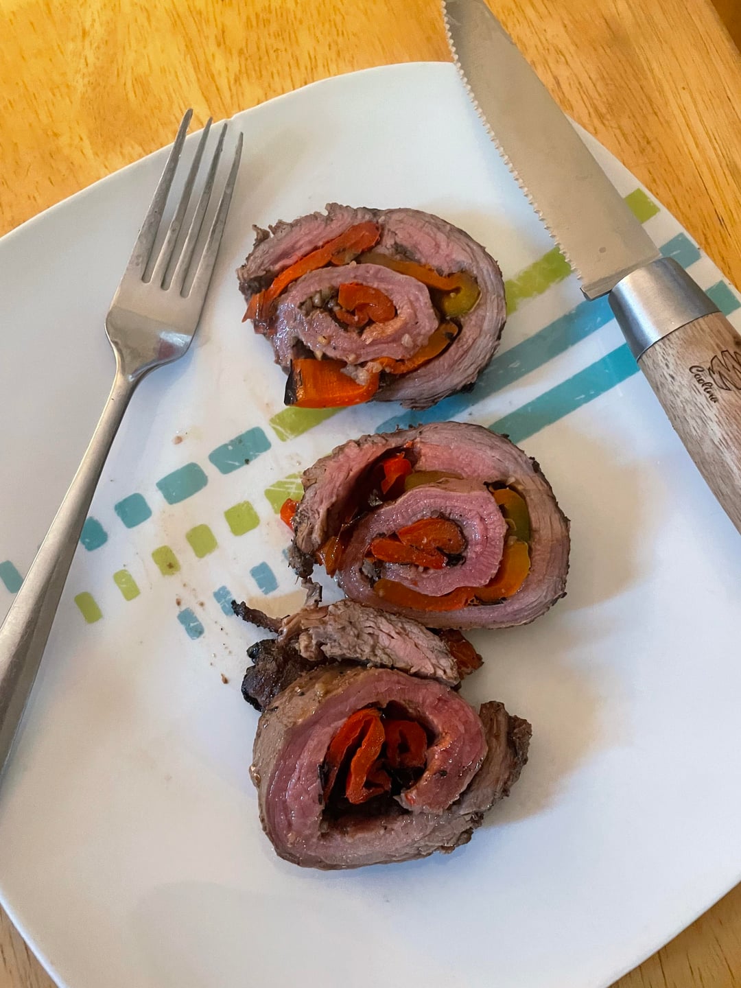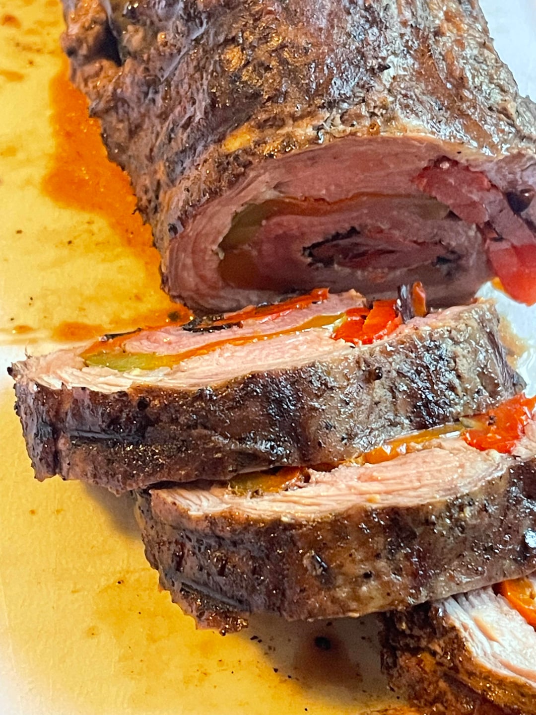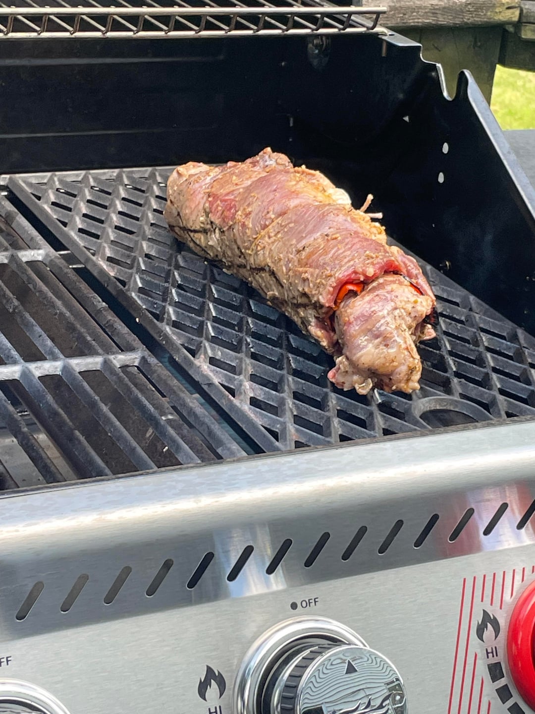Flank steak pounded for tenderizing then pressure marinated with the chamber vac for 4hrs with a Mojito Lime marinade,then butterflied and rubbed down with garlic on the inside and then stuffed with with fire roasted Marcono Peppers from the garden, and seared and off set grilled