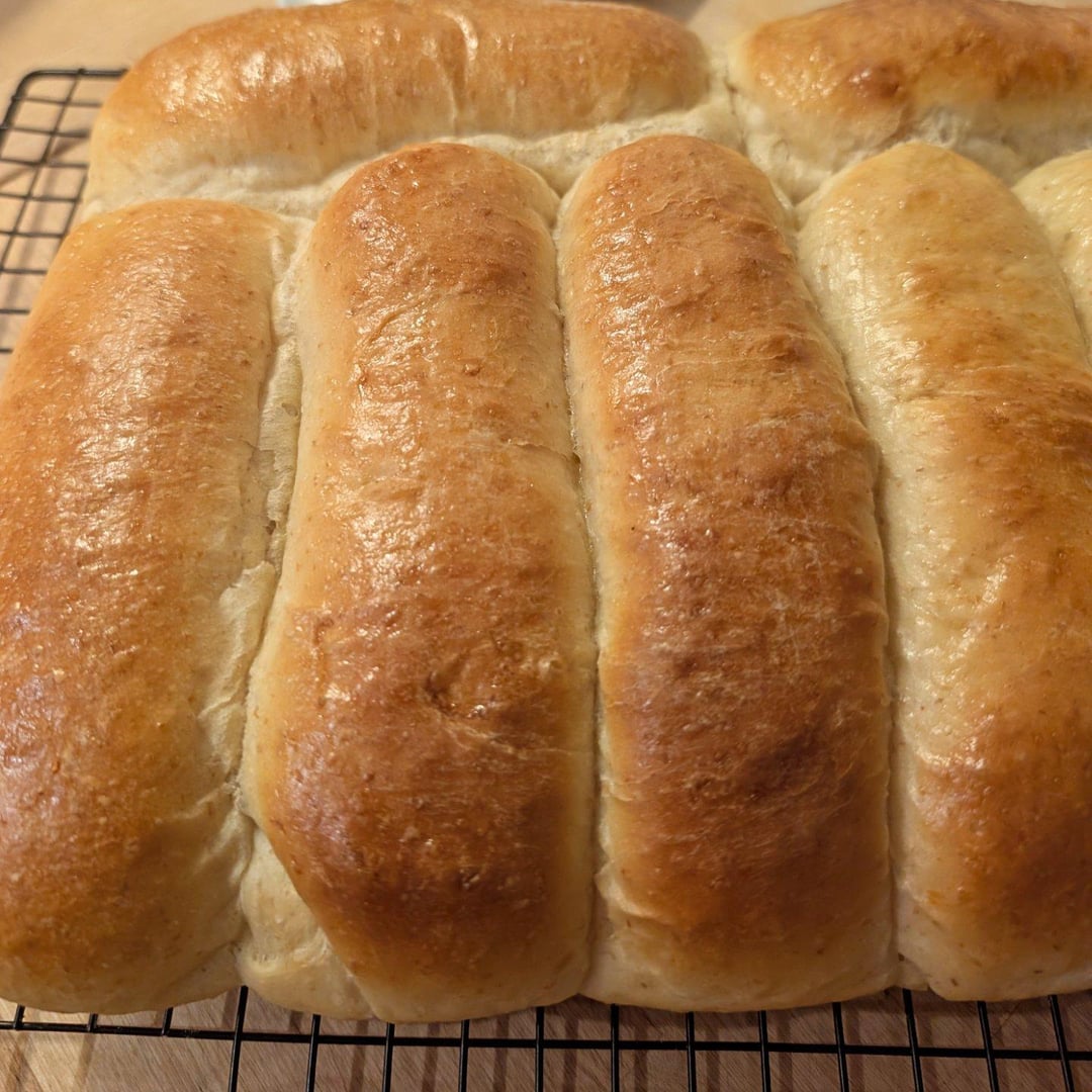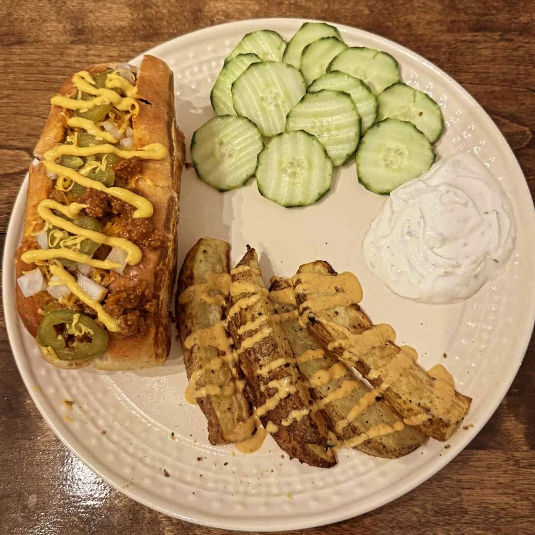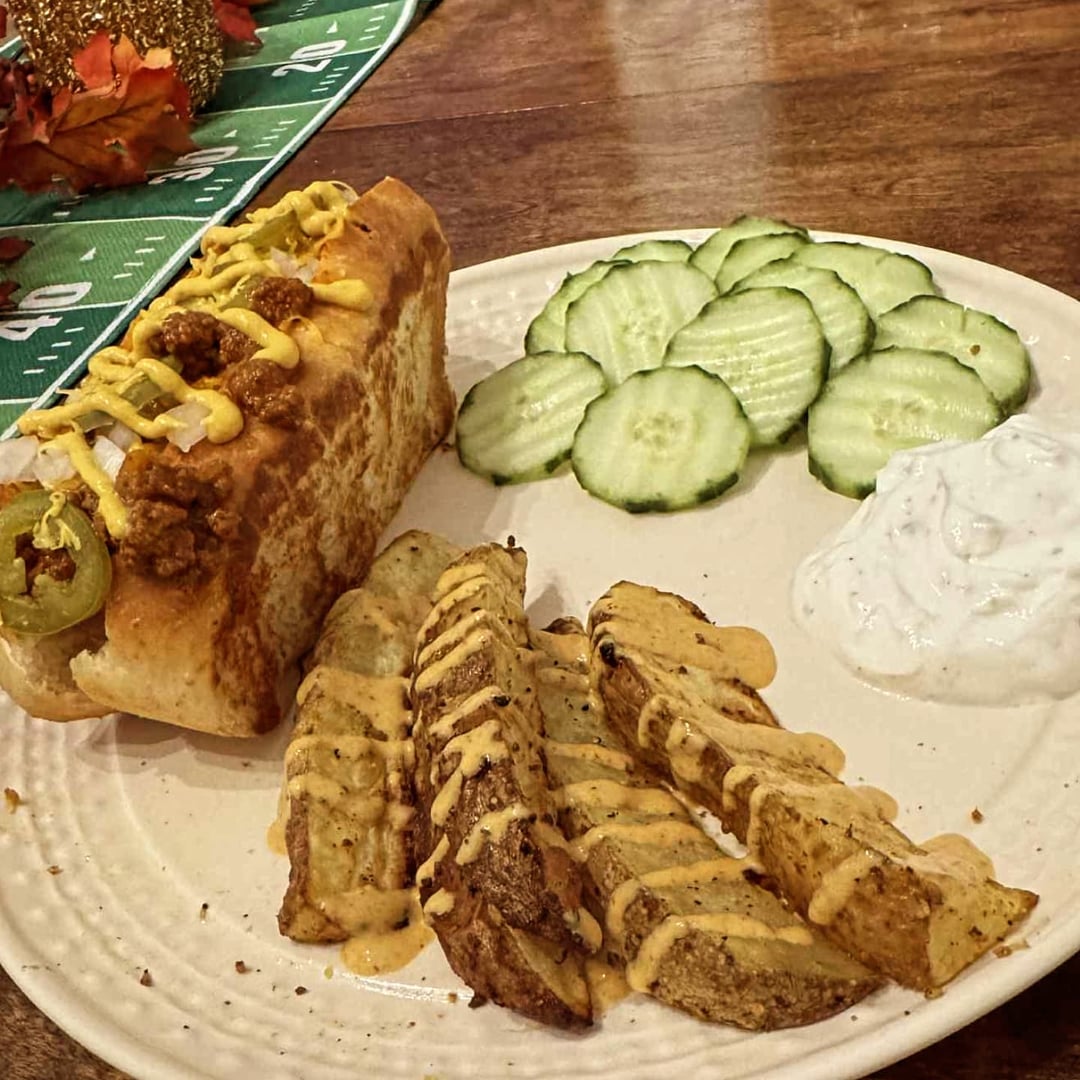Drank, cooked , and watched the Packers. Sourdough discard buns, home pickled jalapenos, beef/pork hot dogs, potato wedges in the air fryer and cucumbers with ranch dip, although I admit cucumbers and dip aren't cooking – but I was still drunk so it counts.
