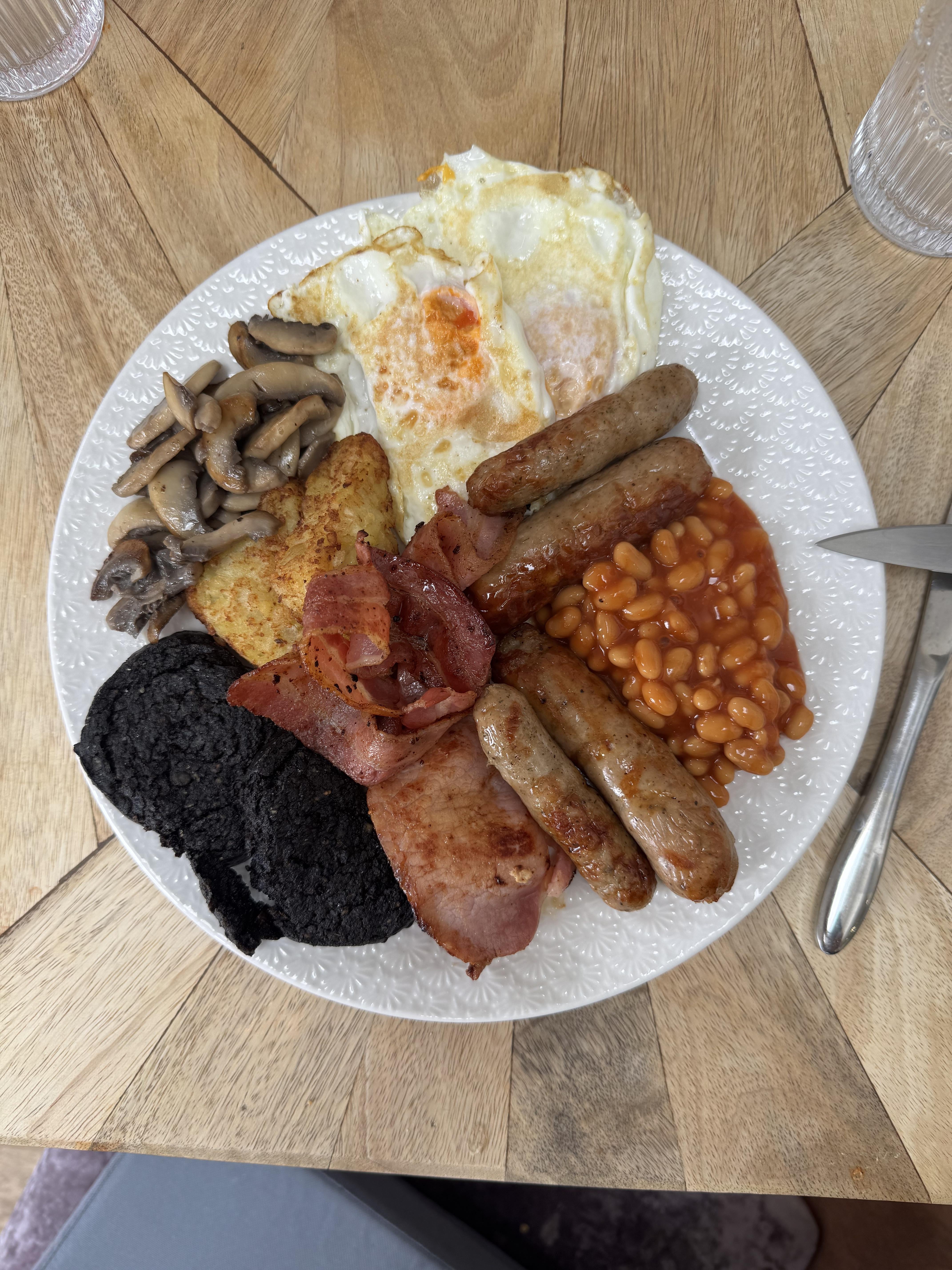 M&S for the ingredients – french bread, toast and even white bread rolls making an appearance on the table – around £6 p/p including drinks. Both back and streaky bacon plus butchers choice and chipolatas for the D&I quota. Disclaimer: No food was consumed within 13 hours of demolishing this fry up
