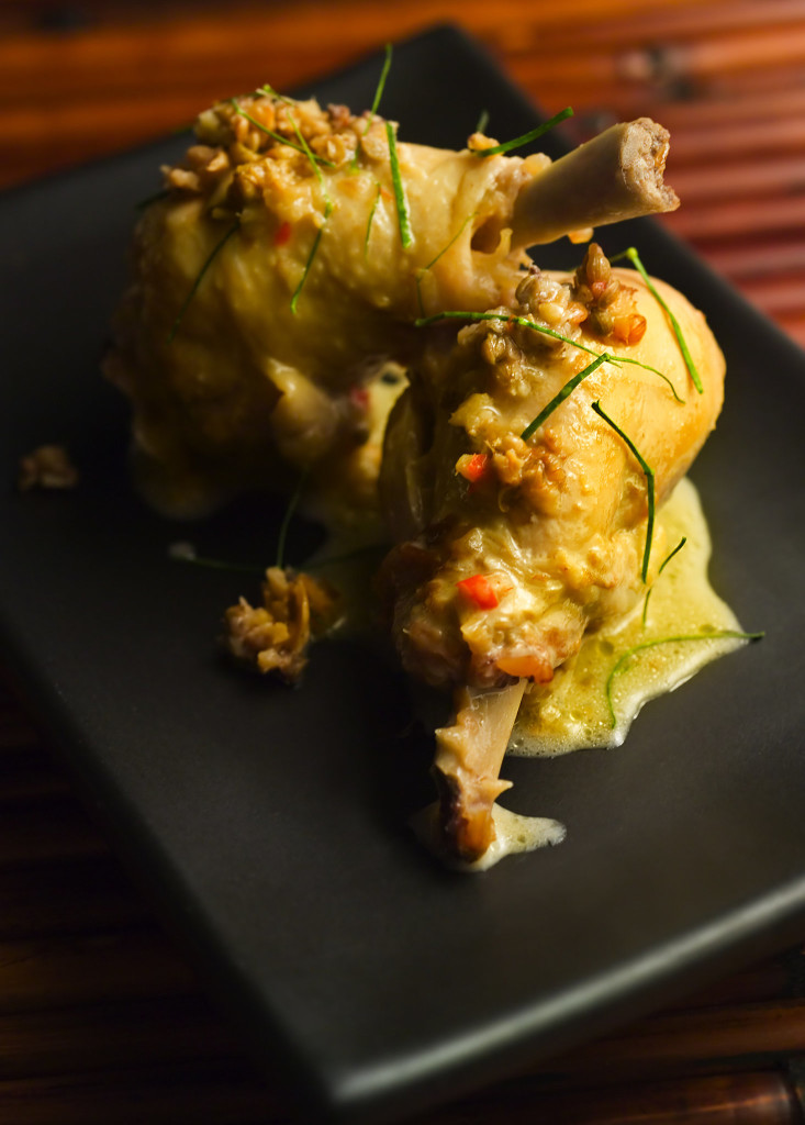 - 2 ½ to 3 pounds skin-on chicken legs, thighs or both (if possible, have thighs cut in half and knuckle cut off legs), patted dry