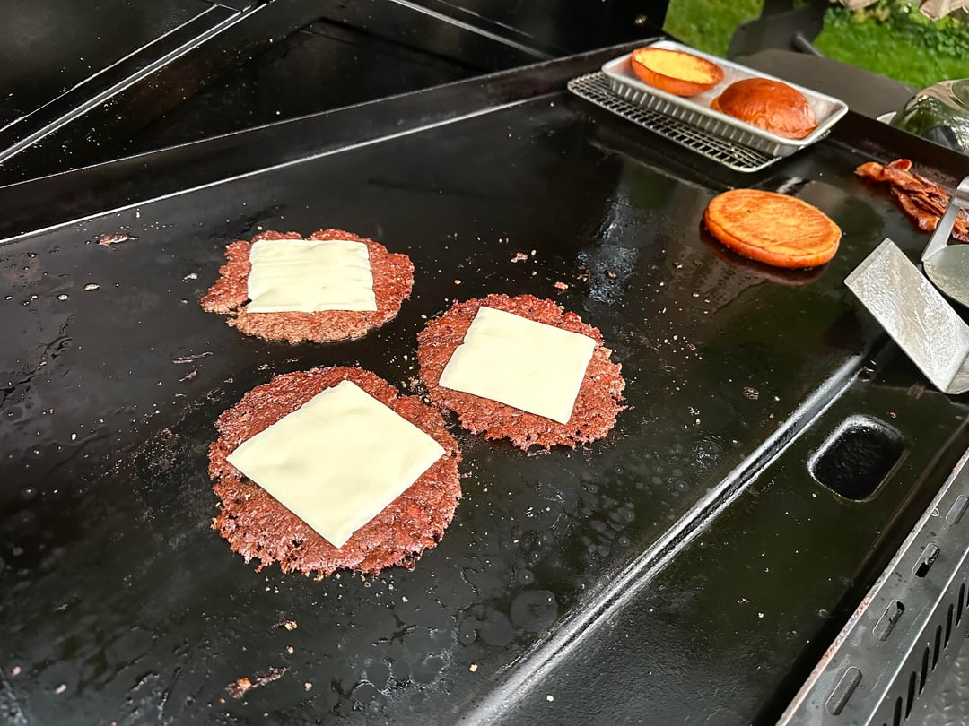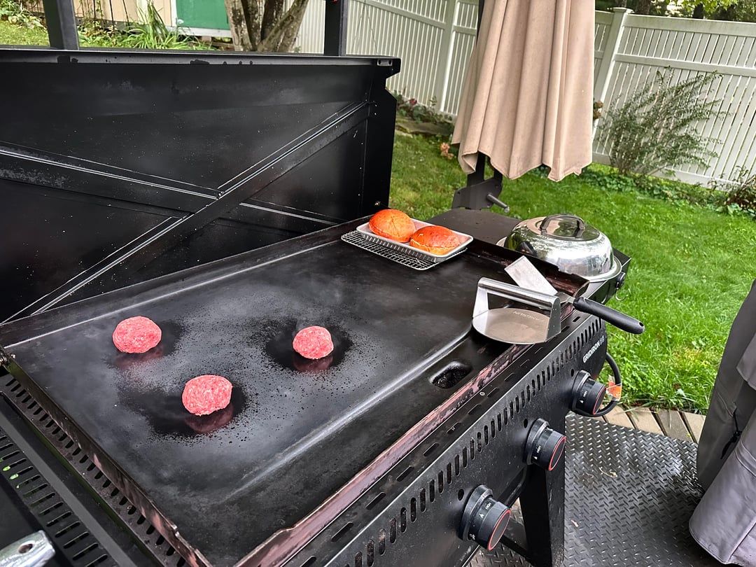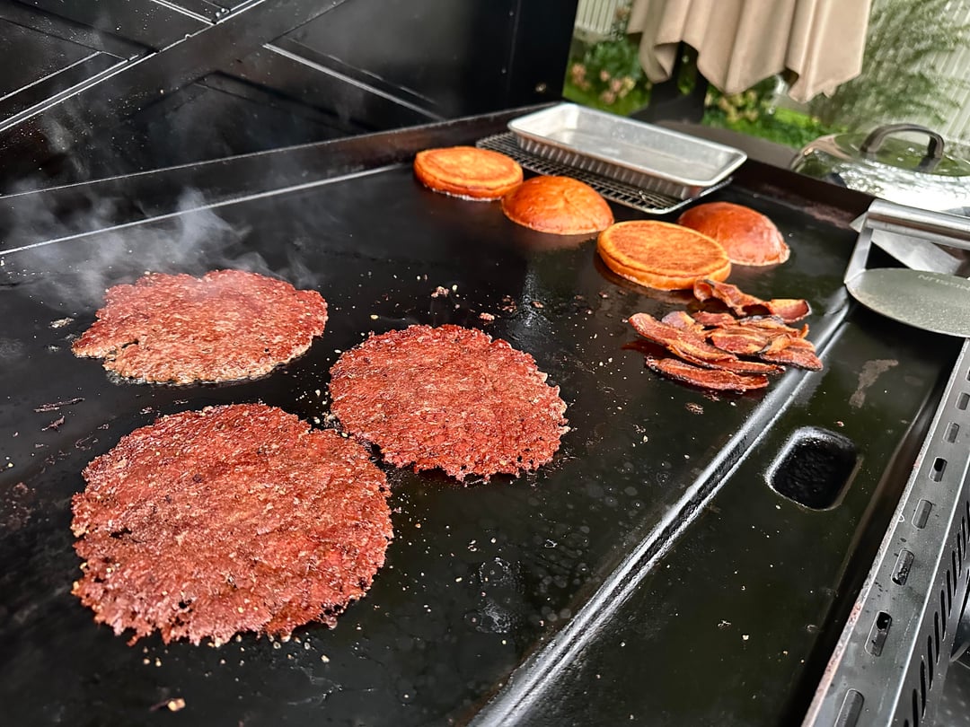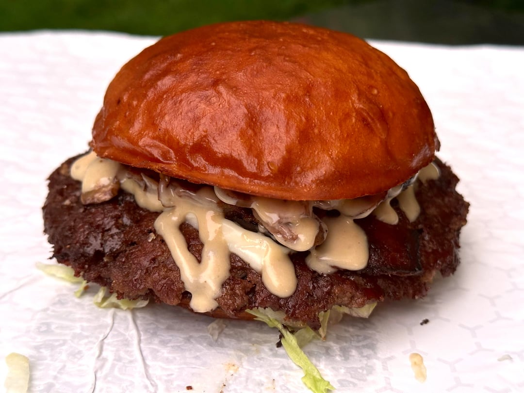 Burger night! This week’s special had home ground chuck smash patties, Swiss singles, bacon, Crimini mushrooms, and a homemade maple roasted garlic sauce, on buttered and griddled homemade buns.