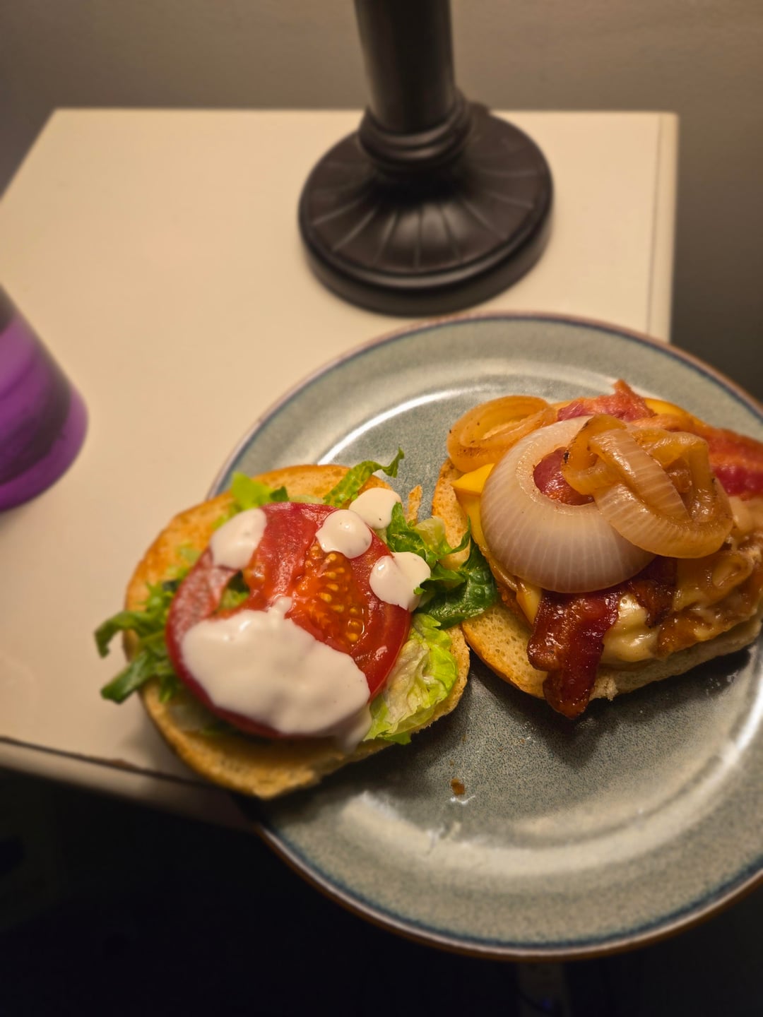 From bottom to top: Tyson frozen chicken patty Gouda Bacon Grilled onions Ranch Tomatoes Shredded lettuce On a slightly stale Brioche bun that was toasted