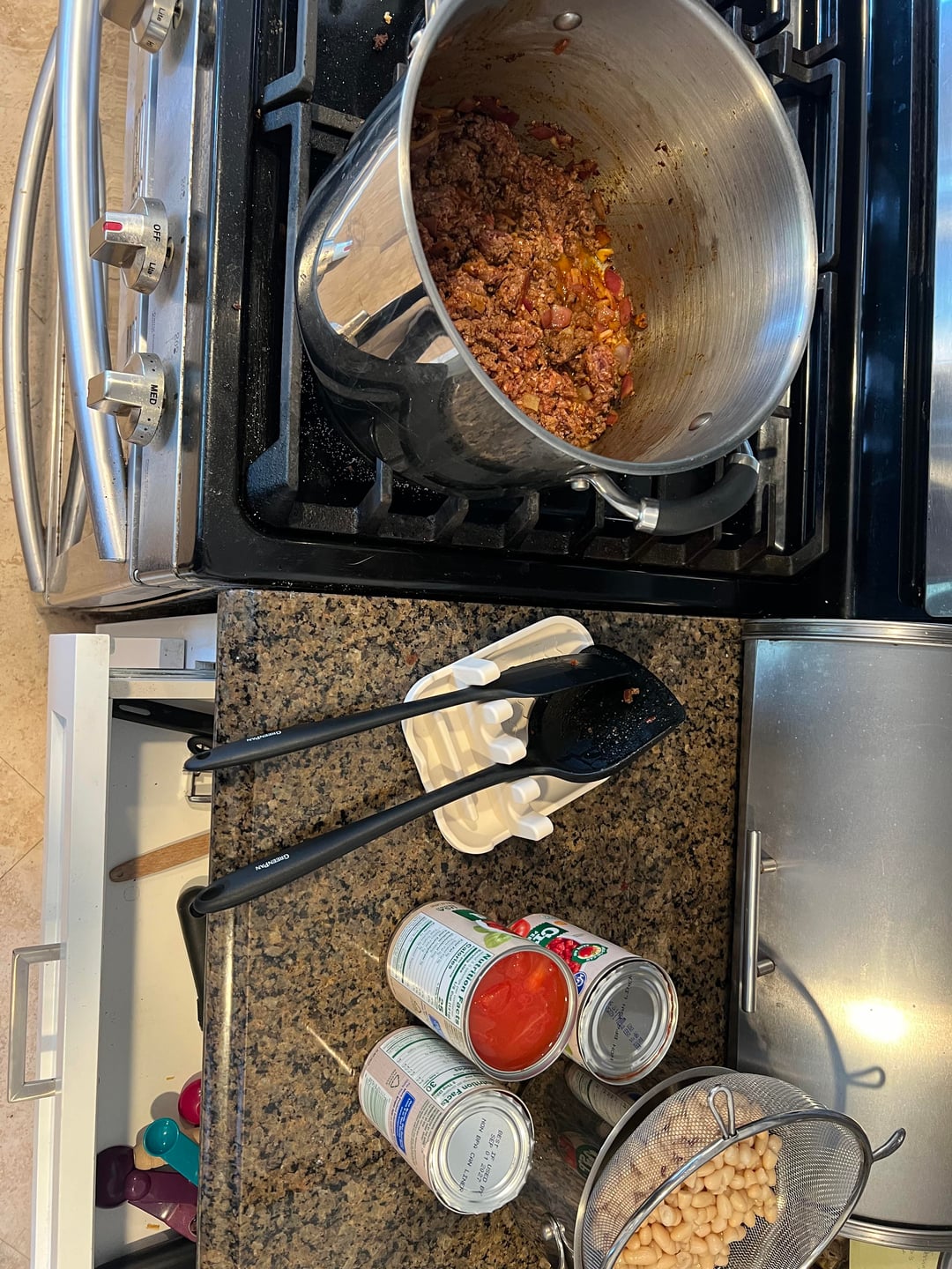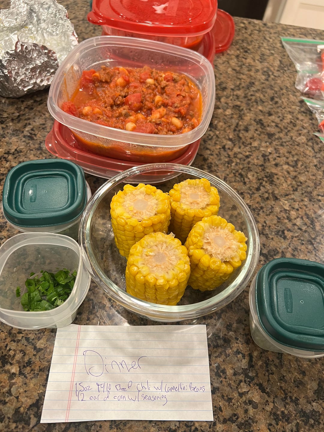 *Dinner- homemade chili with cannellini beans instead of kidney and 90/10 ground beef. 1/4lb of beef in each 10oz serving. 1/2 ear of corn.
