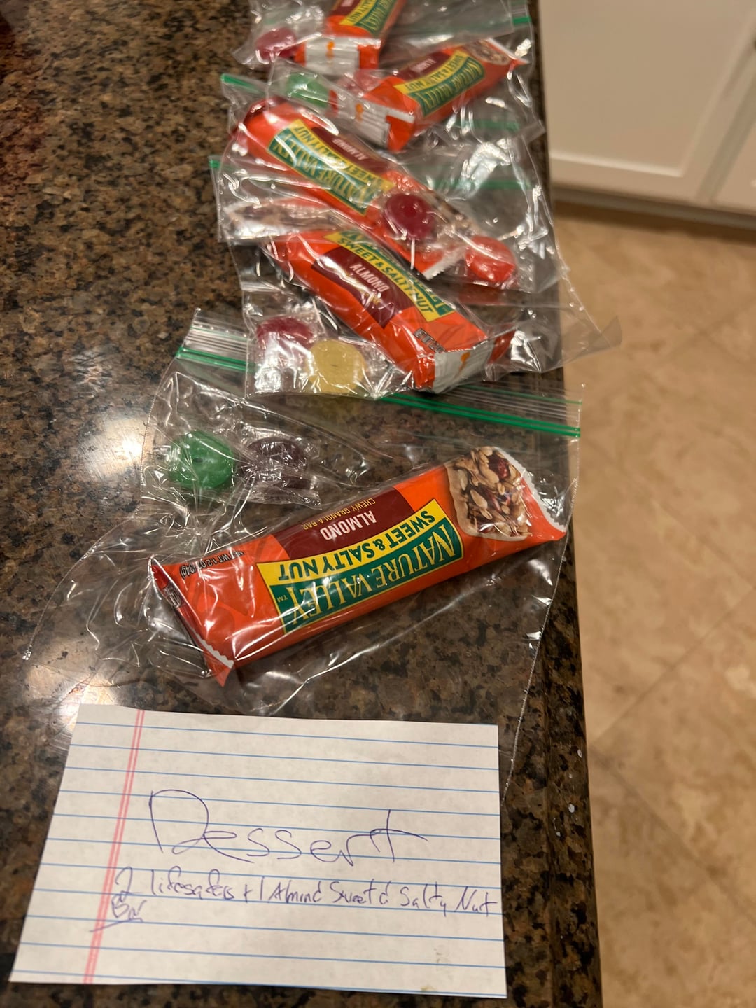 *Dessert- Sweet and Salty Almond Bar, couple of lifesaver hard candy’s.