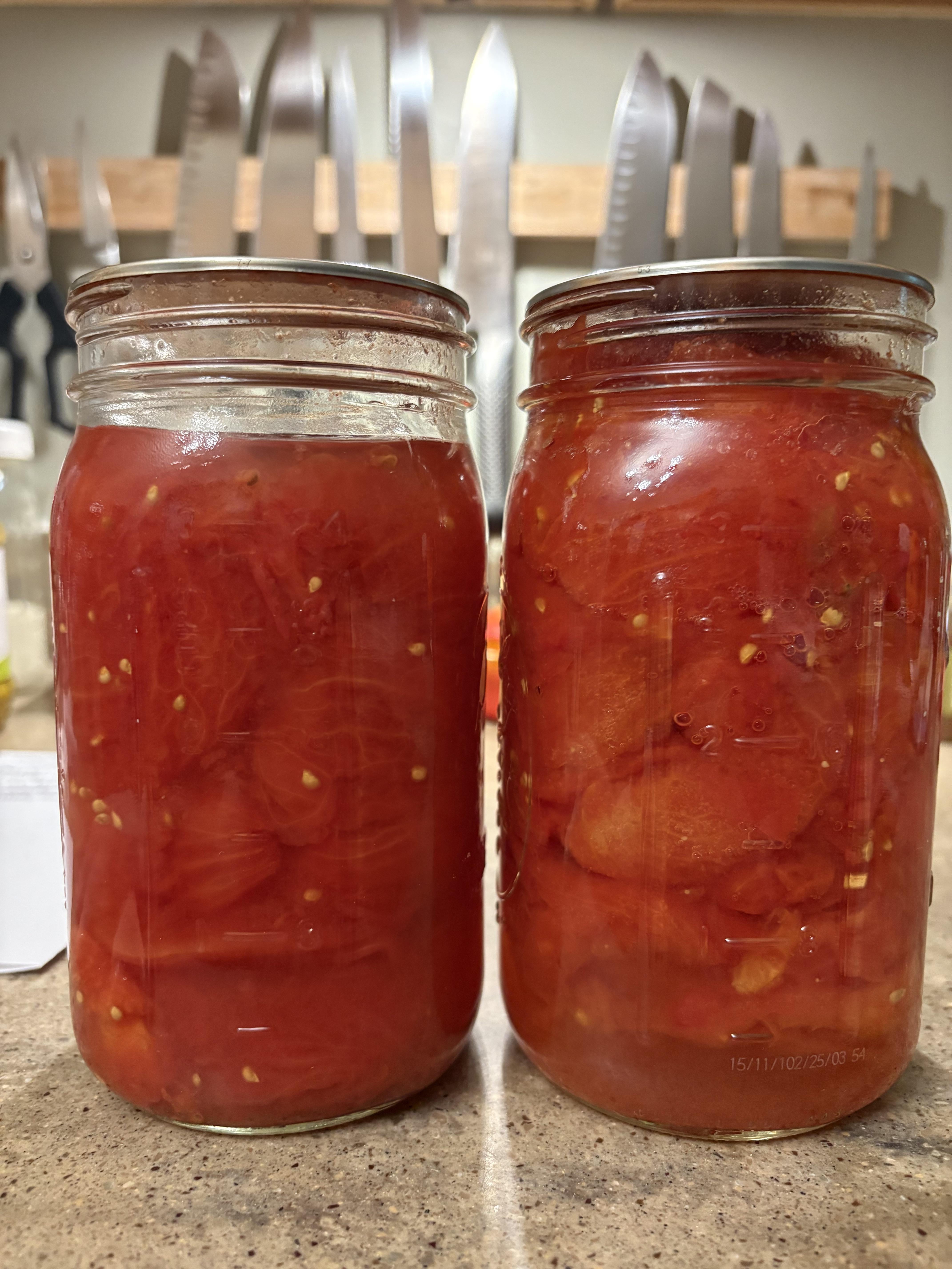 Two Sealed Ball Quart jars of hot pack crushed tomatoes sit on a tan countertop at eye level. You can’t see the labels, but the left one is from Tomato Weekend 2024 and the right one is from Tomato Weekend 2025.