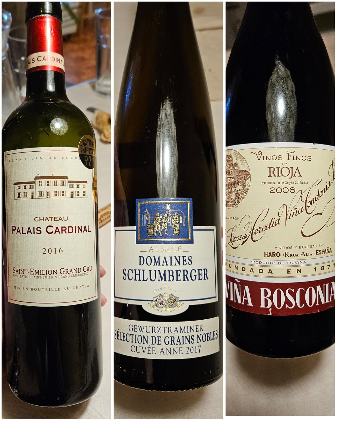 Somewhat in response to some comments about the 2006 Boscoñia. Funny thing is, same restaurant, different people, social gathering with amateurs, originally brought 2 bottles: Schlumberger Selection de Grains Nobles Gerwurtztraminer and Viña Boscoñia. Then the restaurant owner said I left a bottle of Chateau Palais Cardinal from 1 or 2 years ago. Everyone, including the Spanish owner like the picked the Gerwurtztraminer as the WOTN.