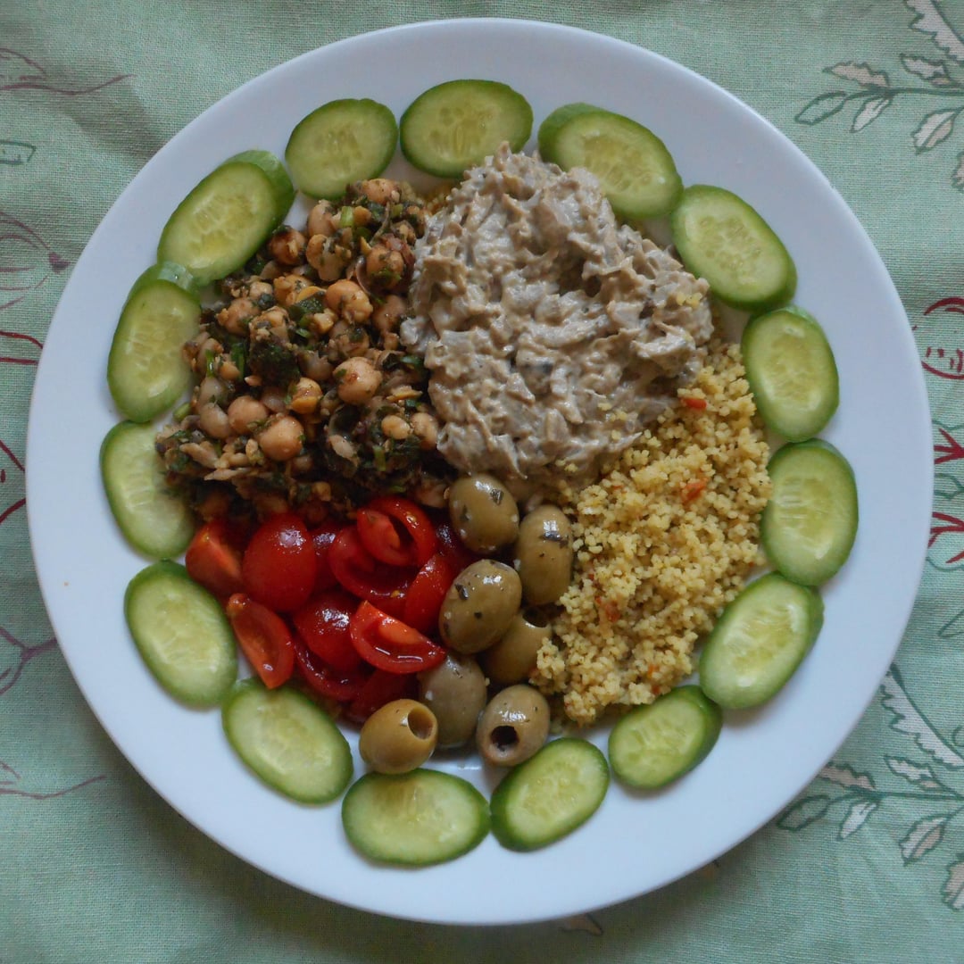 |Chickpea salad: Drain a can of cooked chickpeas, mash them a bit, mix with cinnamon, black pepper, cumin, clove, powered ginger, salt, lemon juice, olive oil and chopped parsley|