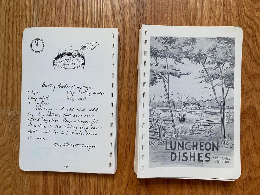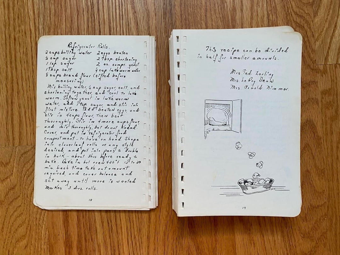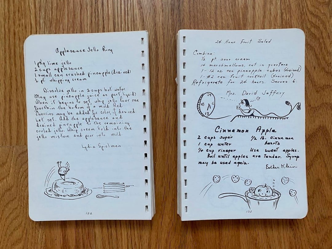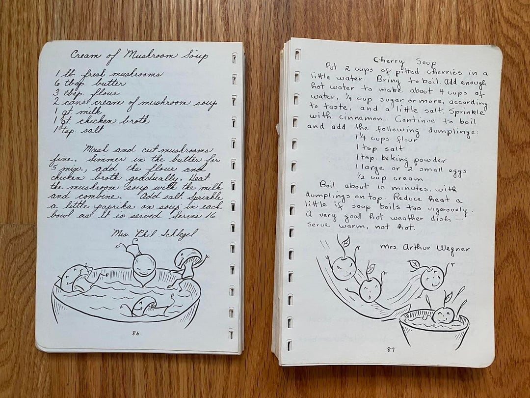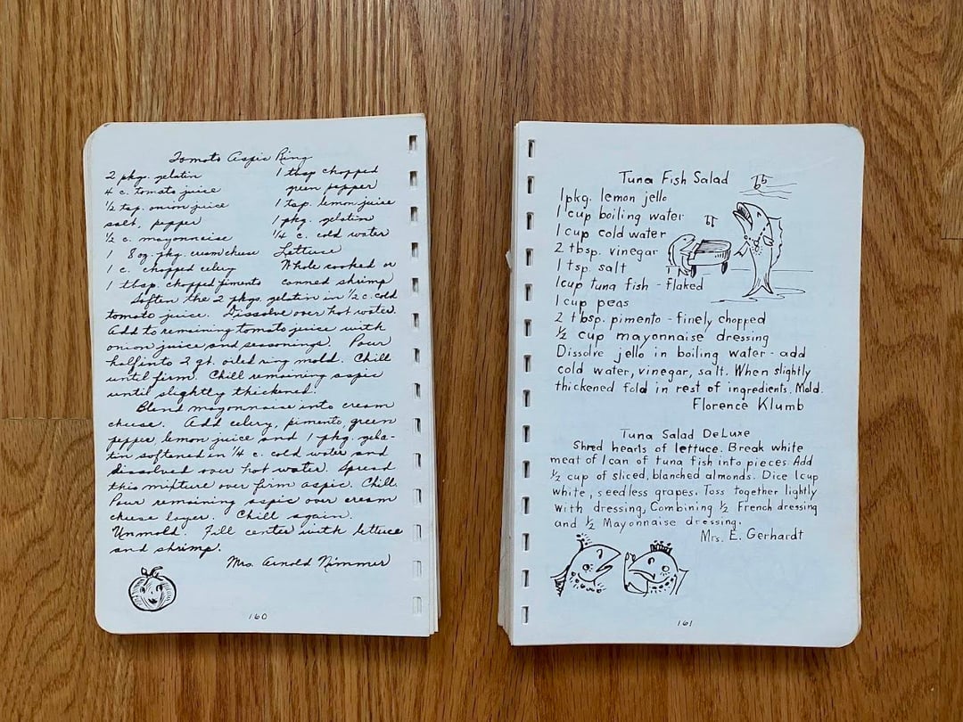 No idea how this cookbook got to my family as we are neither Lutheran nor from West Bend, but I love this one! Originally made in 1949 and I love the handwritten copy and all the doodles in the margins. In classic church cookbook fashion, there is a fair amount of repetition from multiple submissions for things like refrigerator rolls and TWELVE different kuchen recipes (German for cake, had to look it up): icebox, coffee, fruit, cheese, grape, cherry, strawberry, our favorite apple, apple, apple, and rhubarb custard kuchen!