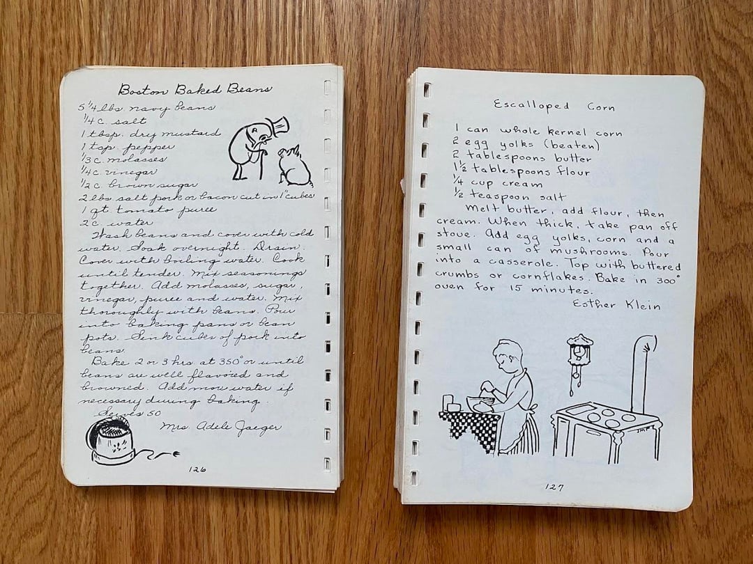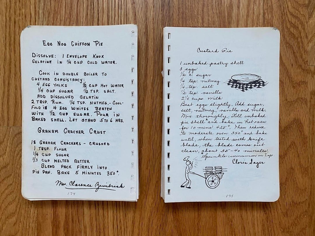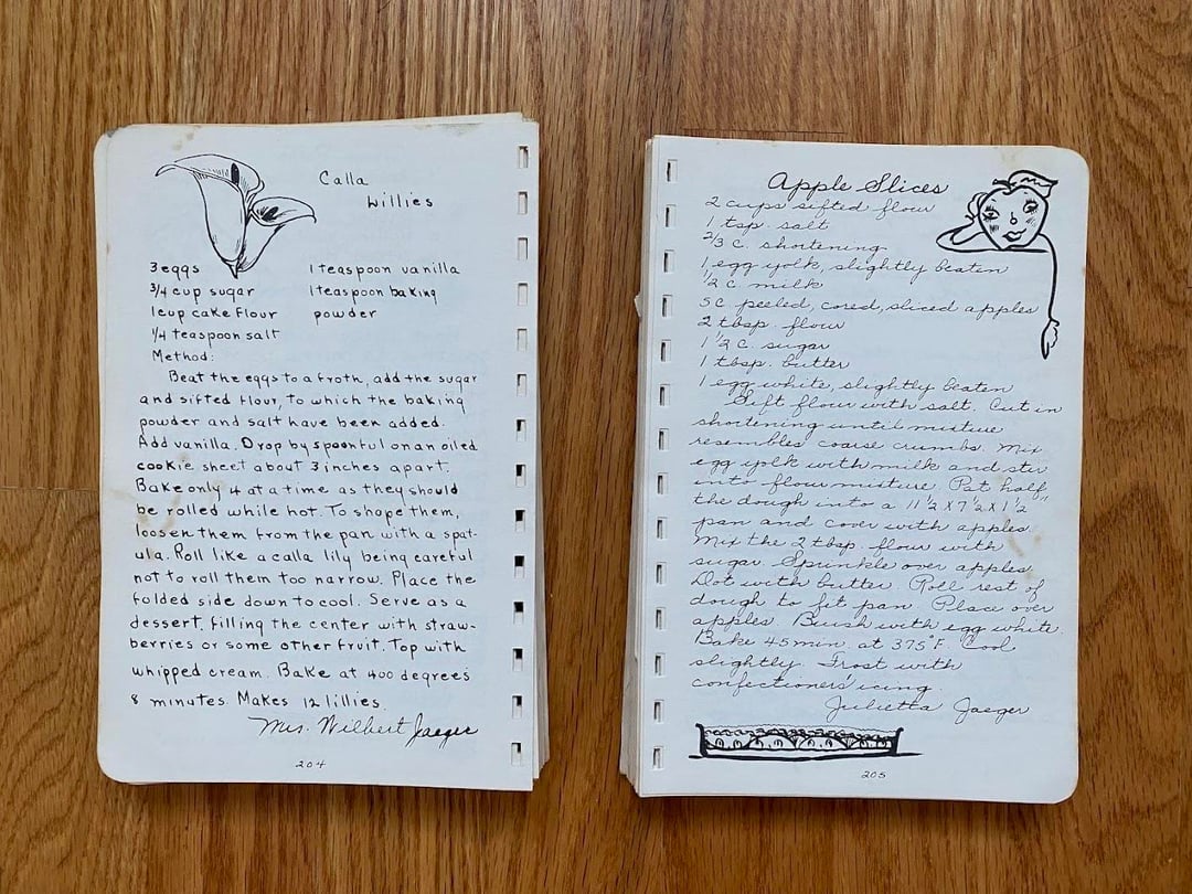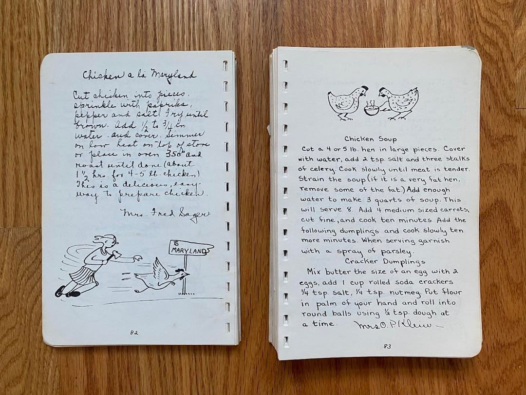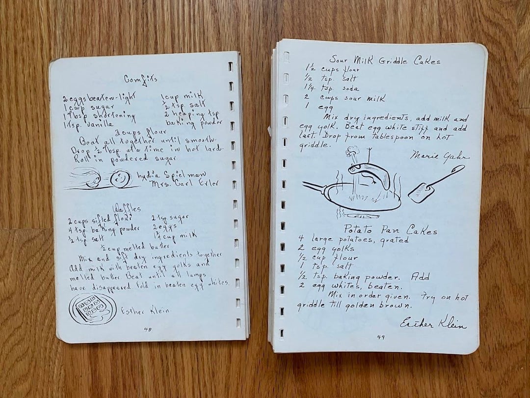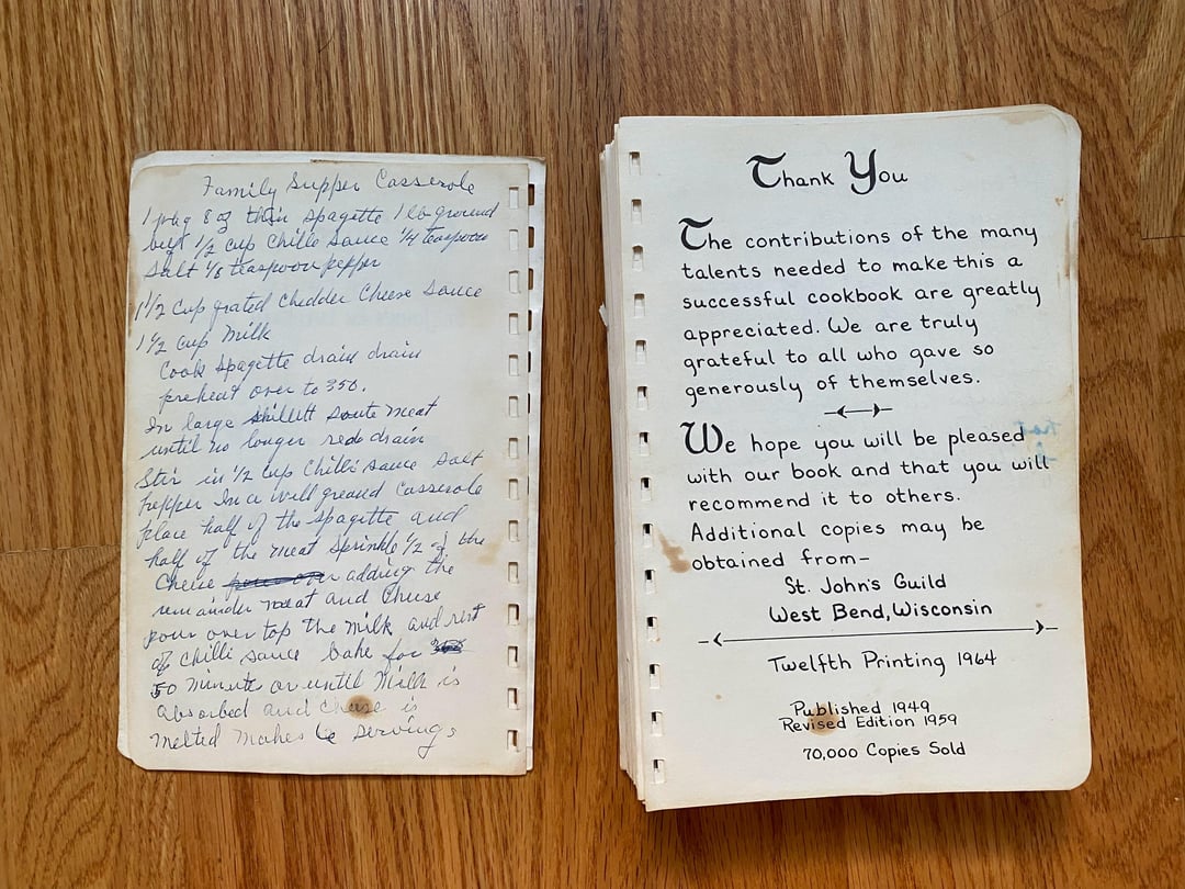 No idea how this cookbook got to my family as we are neither Lutheran nor from West Bend, but I love this one! Originally made in 1949 and I love the handwritten copy and all the doodles in the margins. In classic church cookbook fashion, there is a fair amount of repetition from multiple submissions for things like refrigerator rolls and TWELVE different kuchen recipes (German for cake, had to look it up): icebox, coffee, fruit, cheese, grape, cherry, strawberry, our favorite apple, apple, apple, and rhubarb custard kuchen!