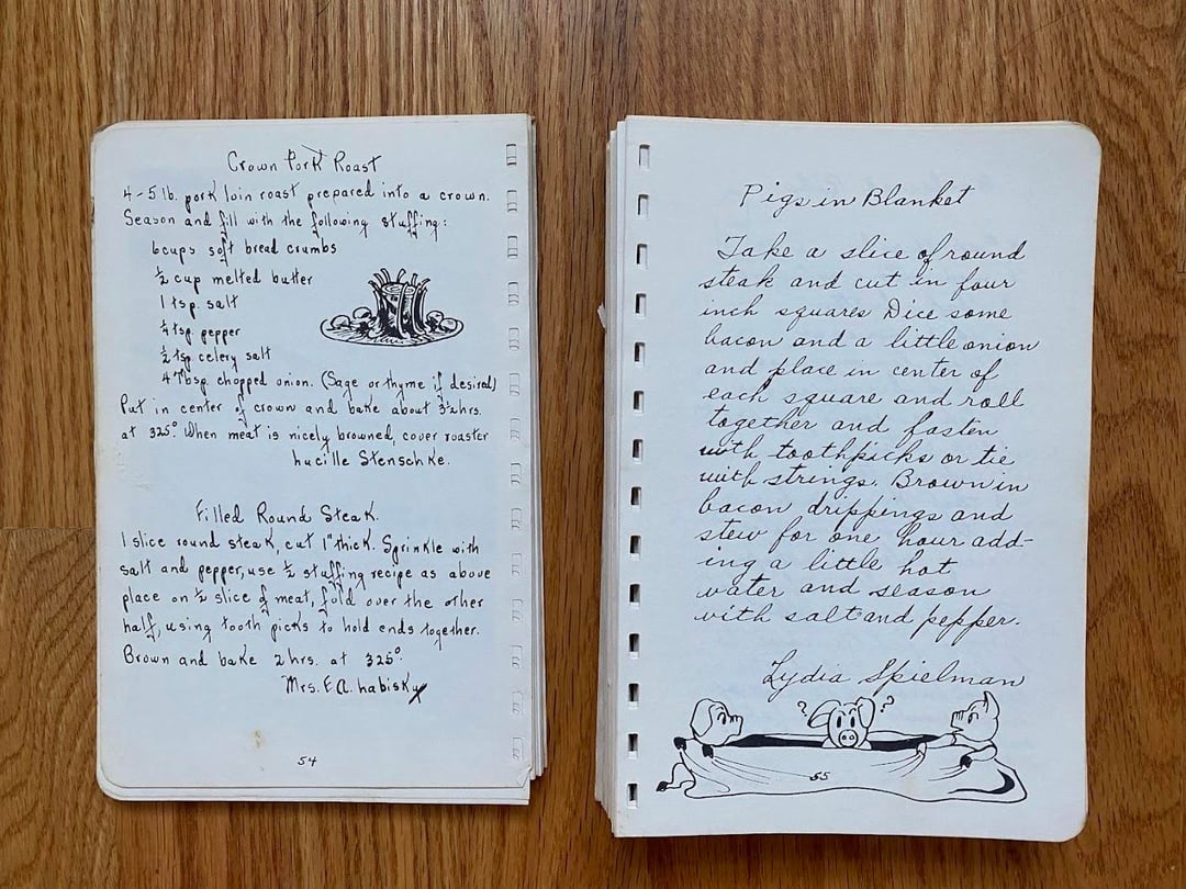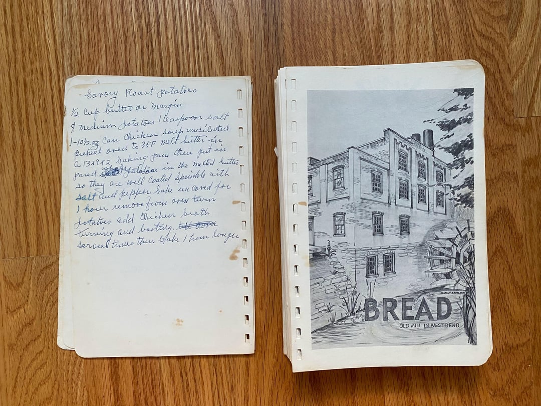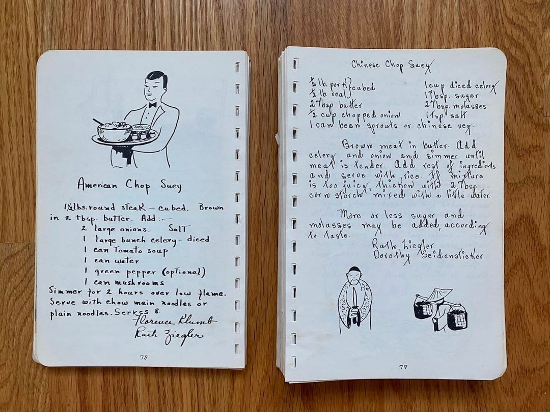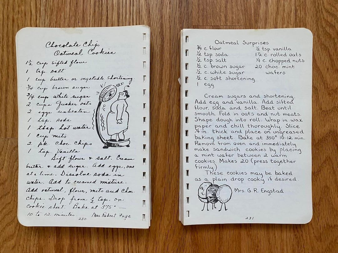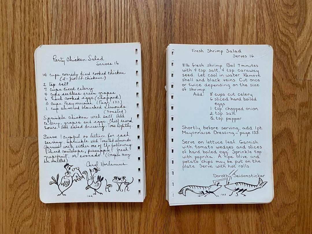 No idea how this cookbook got to my family as we are neither Lutheran nor from West Bend, but I love this one! Originally made in 1949 and I love the handwritten copy and all the doodles in the margins. In classic church cookbook fashion, there is a fair amount of repetition from multiple submissions for things like refrigerator rolls and TWELVE different kuchen recipes (German for cake, had to look it up): icebox, coffee, fruit, cheese, grape, cherry, strawberry, our favorite apple, apple, apple, and rhubarb custard kuchen!