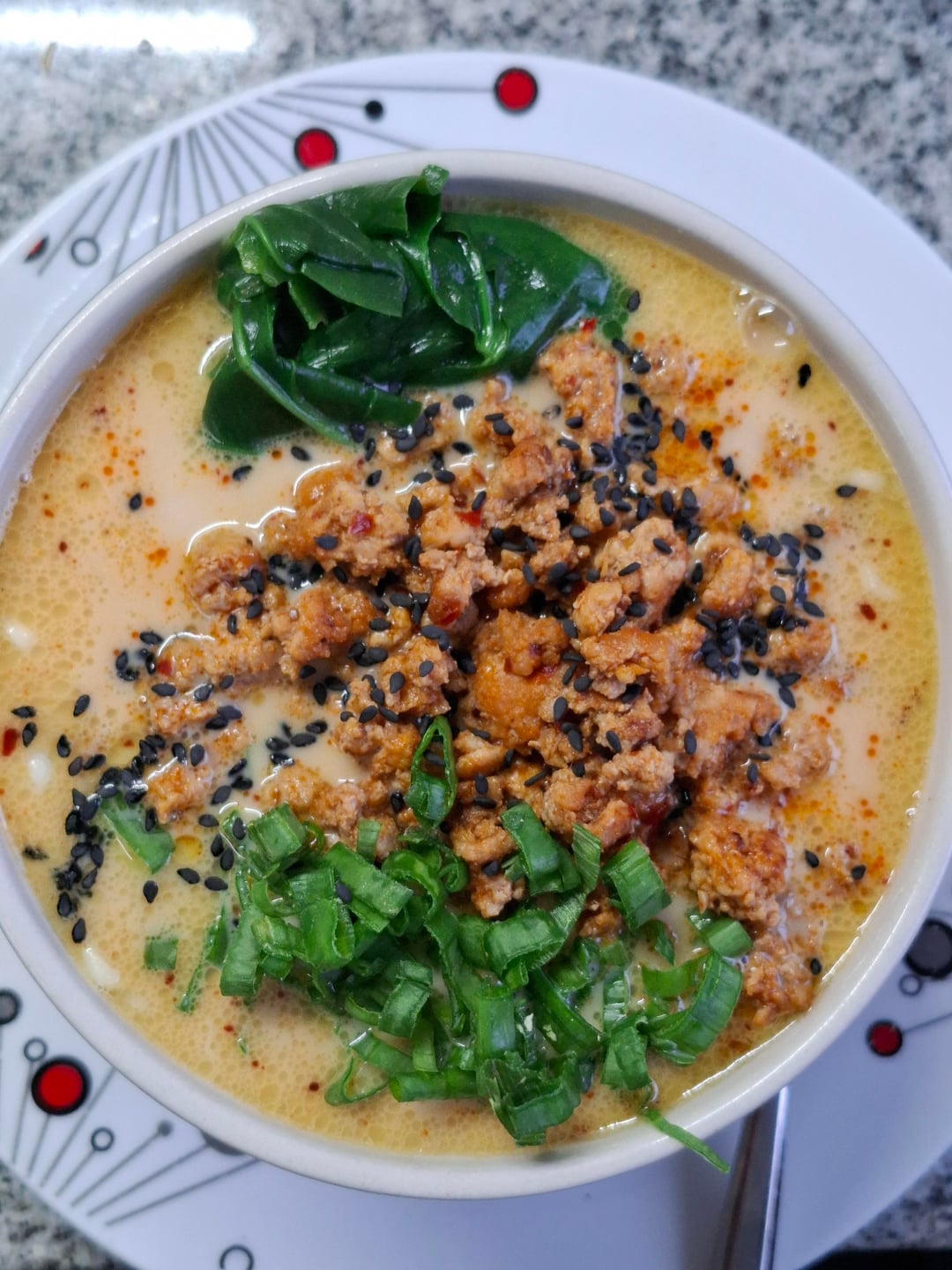I made soyu ramen and tantanmen; I used instant noodles in both, but I made everything else from scratch. I didn't have chili oil for the tantanmen, so I used chili powder; that's why it doesn't have a red color on the surface.