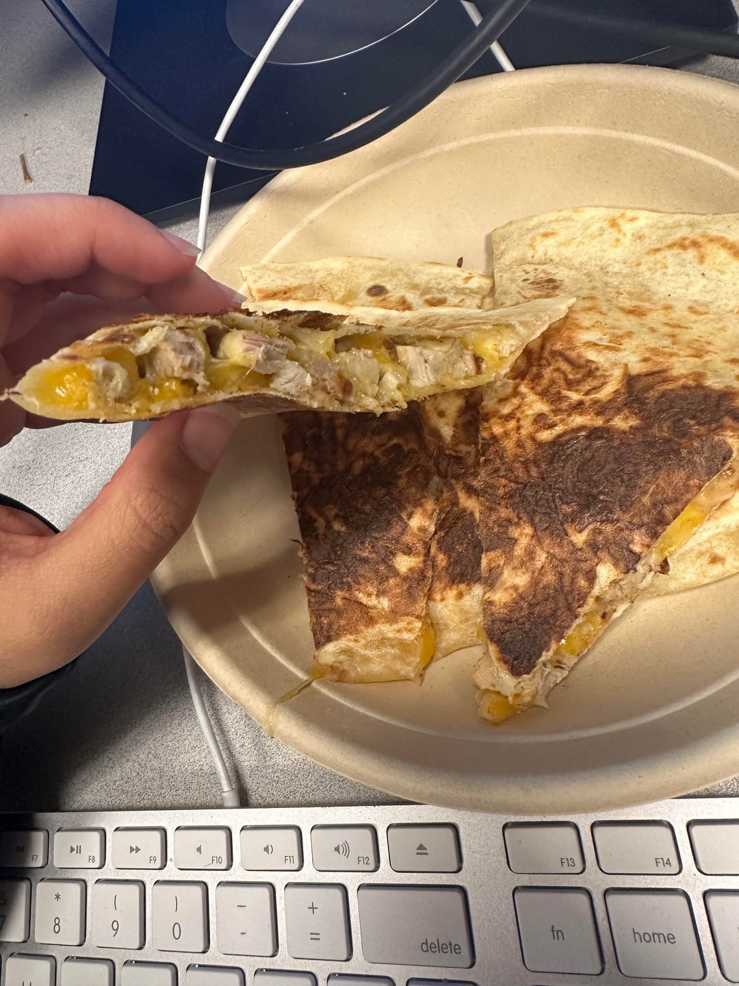 I would straight up ask the brand of cheese and tortilla lol. Get as close as you can to knowing how much it actually is. I’m guessing nearly 3/4ths a cup of mild cheddar cheese or Monterey Jack/mexican blend cheese, 1/2 cup of chicken, a tortilla, and they might have even oiled the pan they browned the tortilla with. With those measurements and no oil, the whole thing would likely be around 600-700 calories.