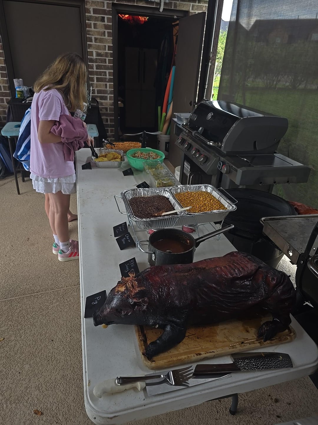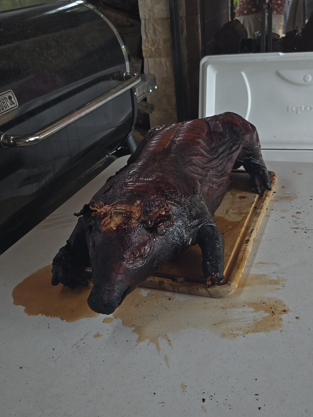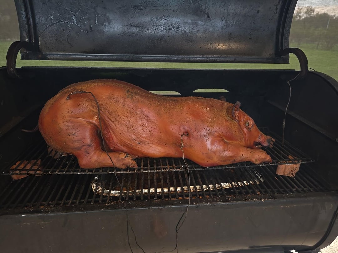 I appreciate this sub and all the questions that came previous. I bought a fresh roaster from a local meat processor and brined it for 10 hours. Dry rub and 10 hours of cooking. I used a drip pan with apple juice and later a baking sheet to protect the lions. Foil on head, ears, and tail. 4 hours prone at 220 and the rest flipped on its back. Sop every couple hours. I struggled with a couple flame outs due to some moisture in my apple and cherry pellets but was happy for my first whole pig.