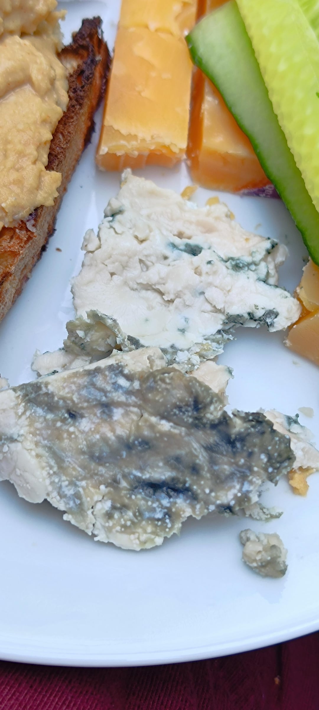 I've bought a blue cheese (Bleu d'Elizabeth) a week ago. The aspect was classic, kinda white with blue stains. I wanted to take a bite today after a week away, and this is what it looked like. The white part was a bit more orange and there are those moldy spots on the sides.