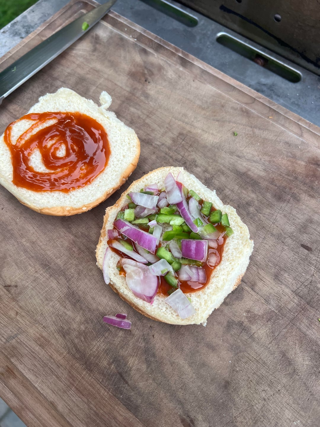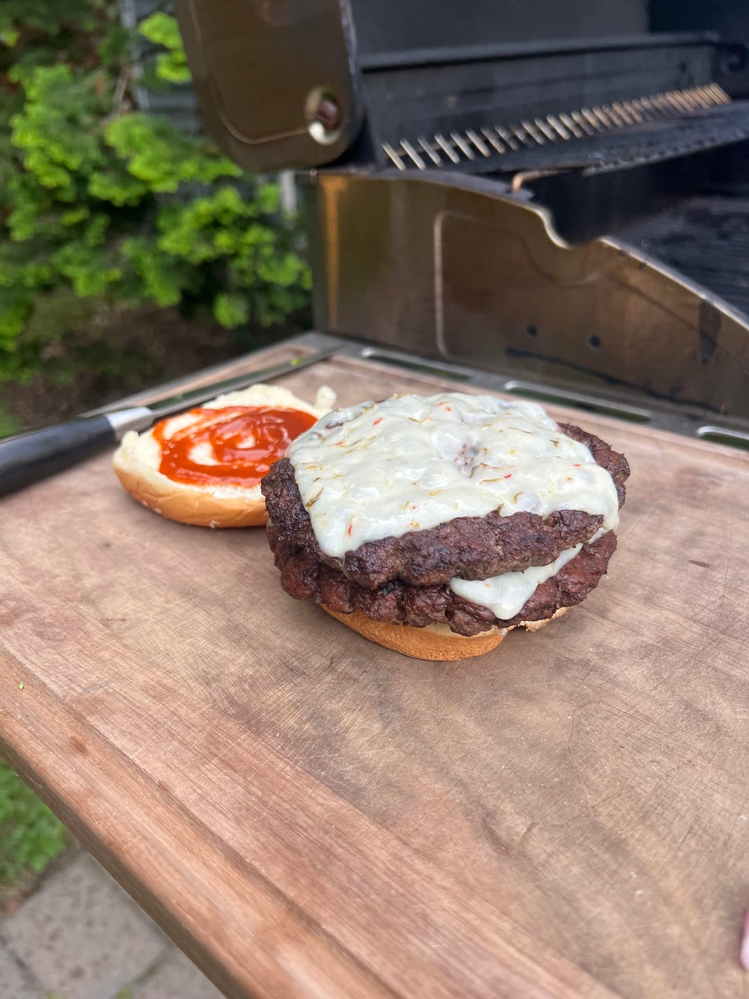 Double smashed with pepperjack, chopped red onion and jalapeño, one sunny side up egg on a seeded bun please.