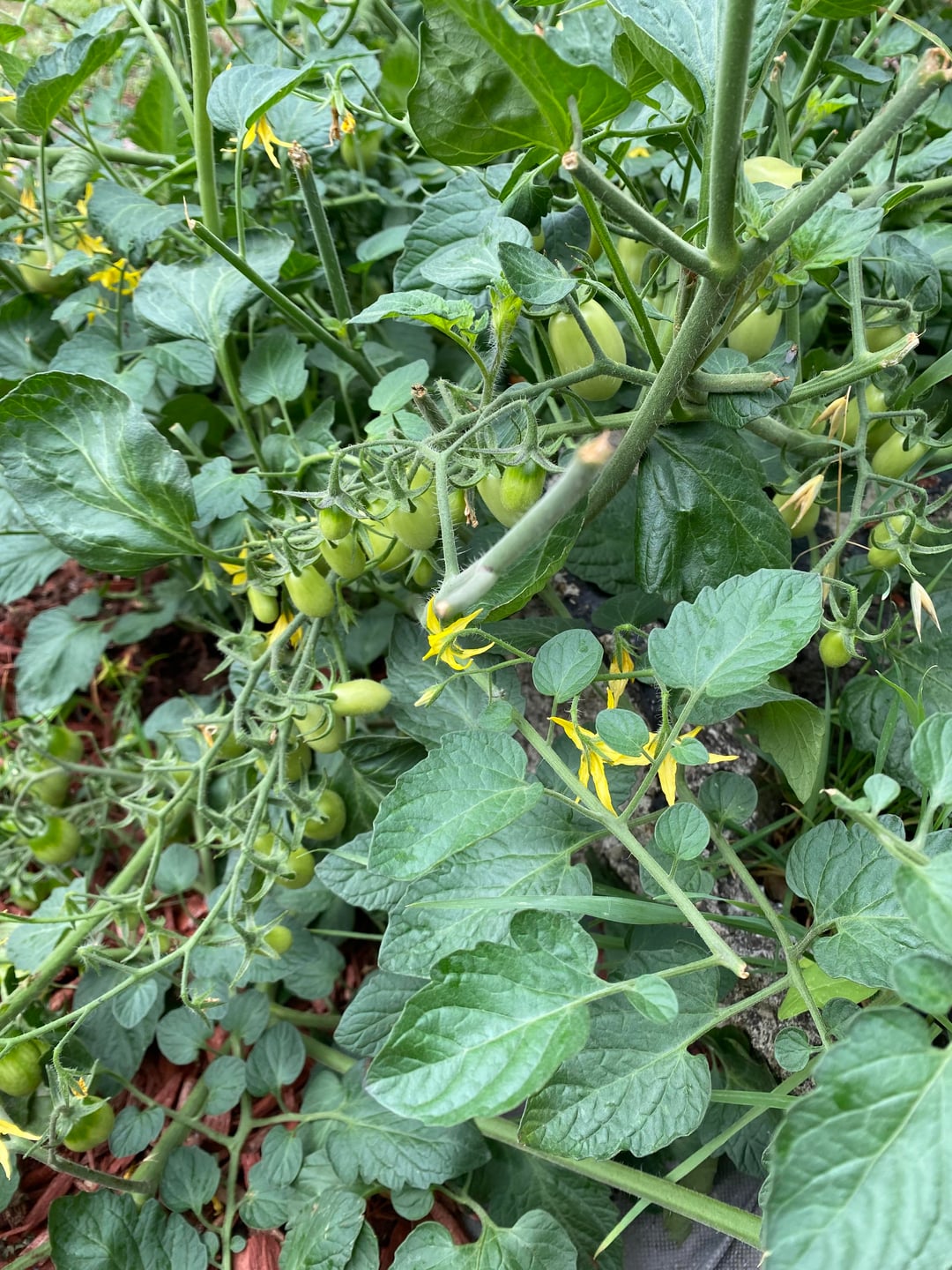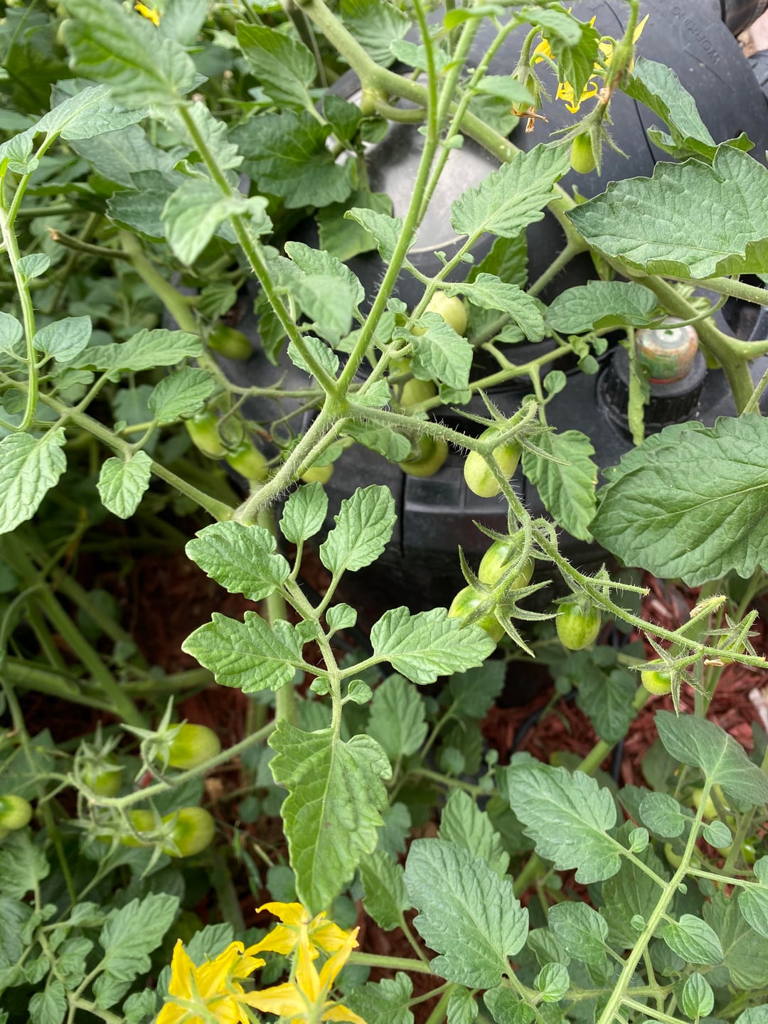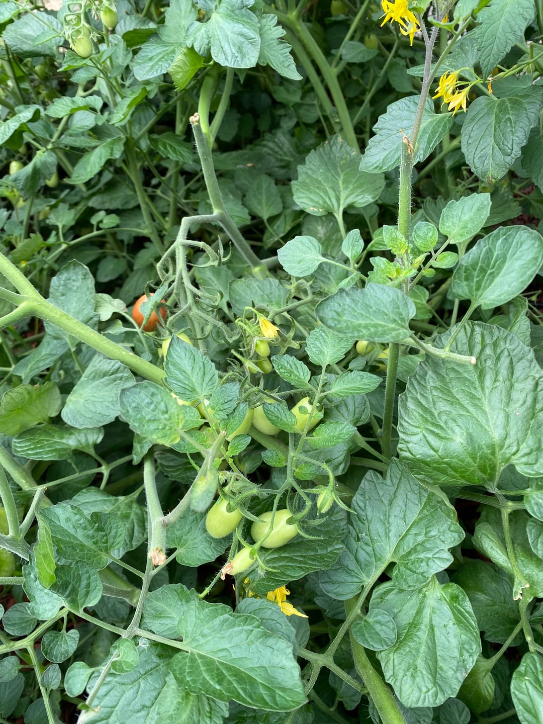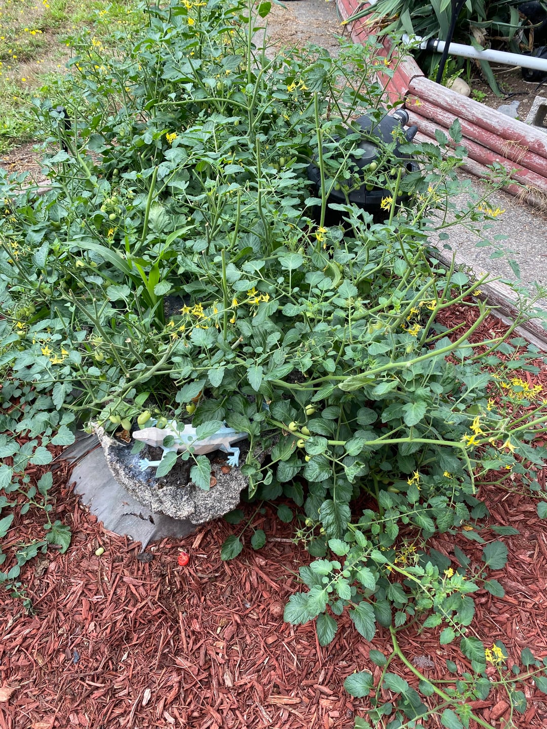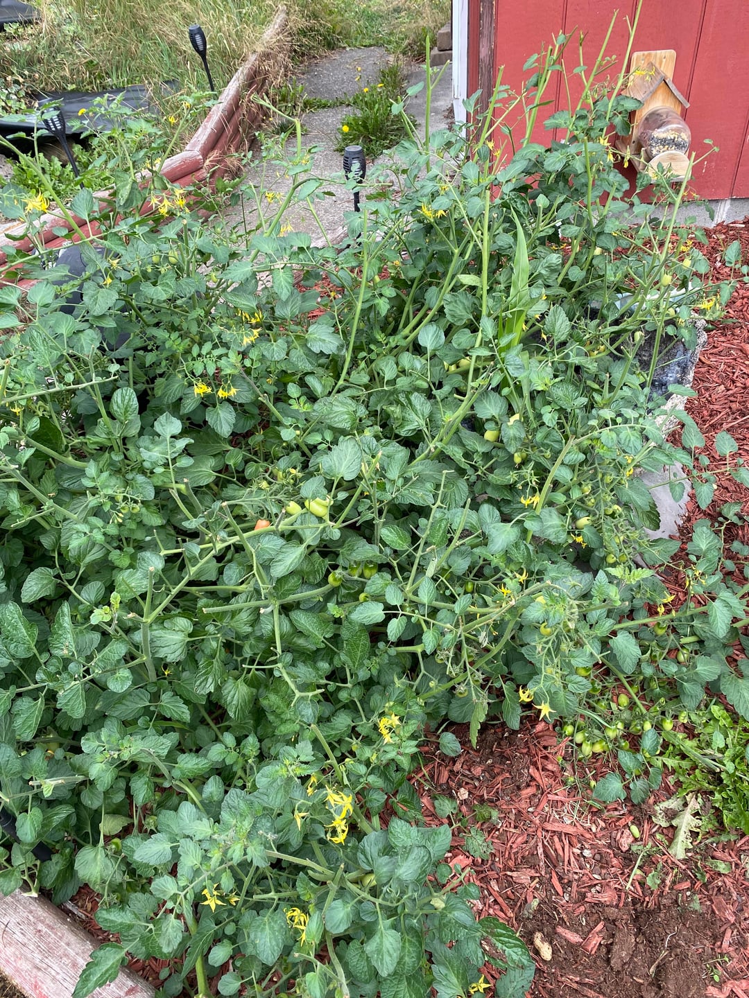 I think yours is impressive, it’s thriving, do you know what variety? We plant sweet millions and sun sugars every year. Last year we also had a black cherry tomato and I’m hoping the volunteer we have this year is a black cherry. It’s not as lush as yours, though.