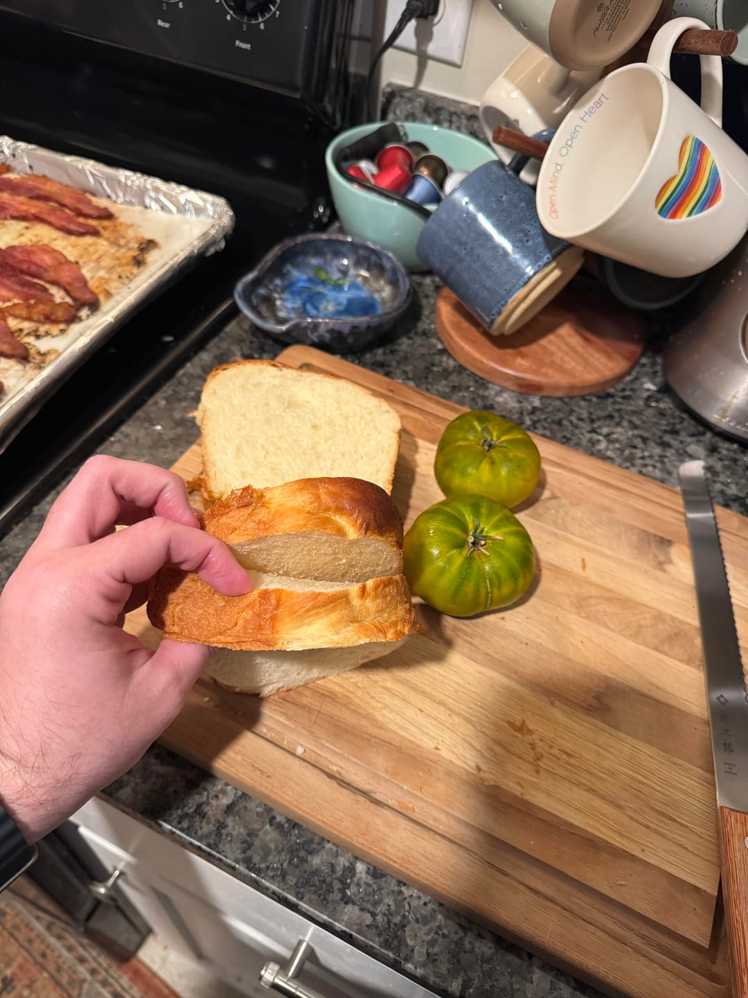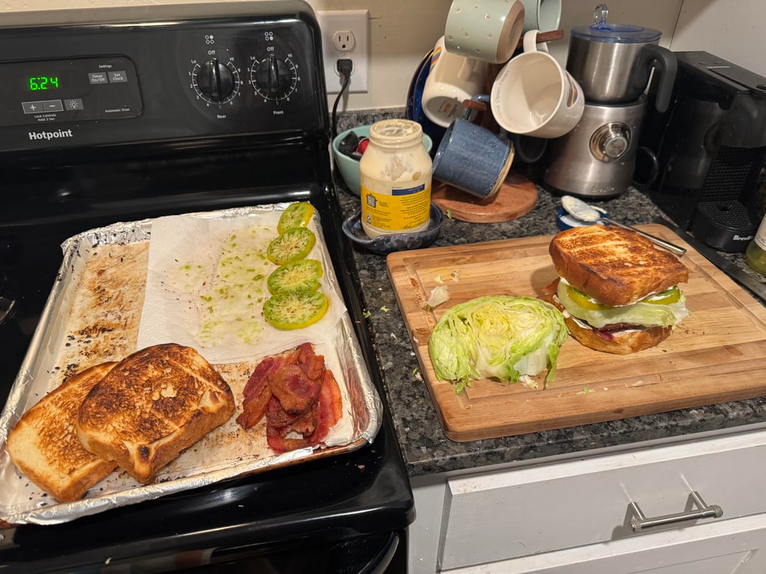 Wright bacon, (fully ripe) green zebra tomatoes, a big slab of iceberg, and Hellman's on two giant slices of the best milk bread I've made yet
