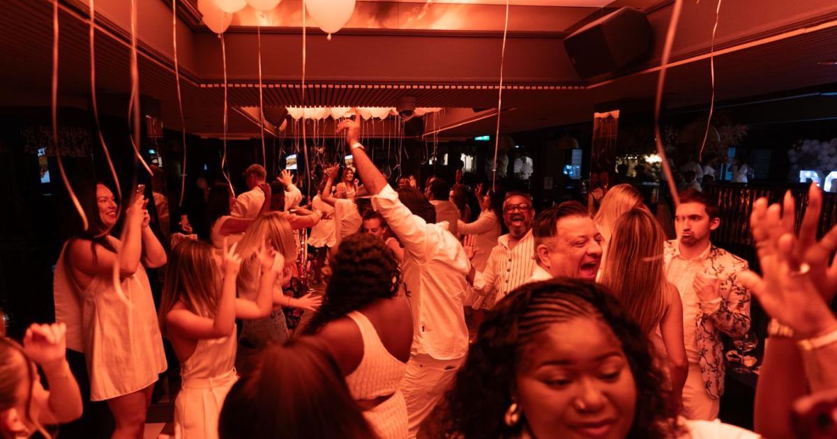 A section of the restaurant was transformed for the occasion into a dance floor, with balloons strewn across the ceiling.