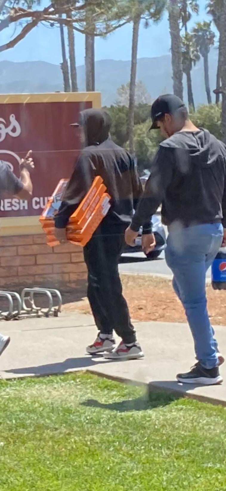 It’s a Little Caesars, he’s probably just carrying it to the trash…
