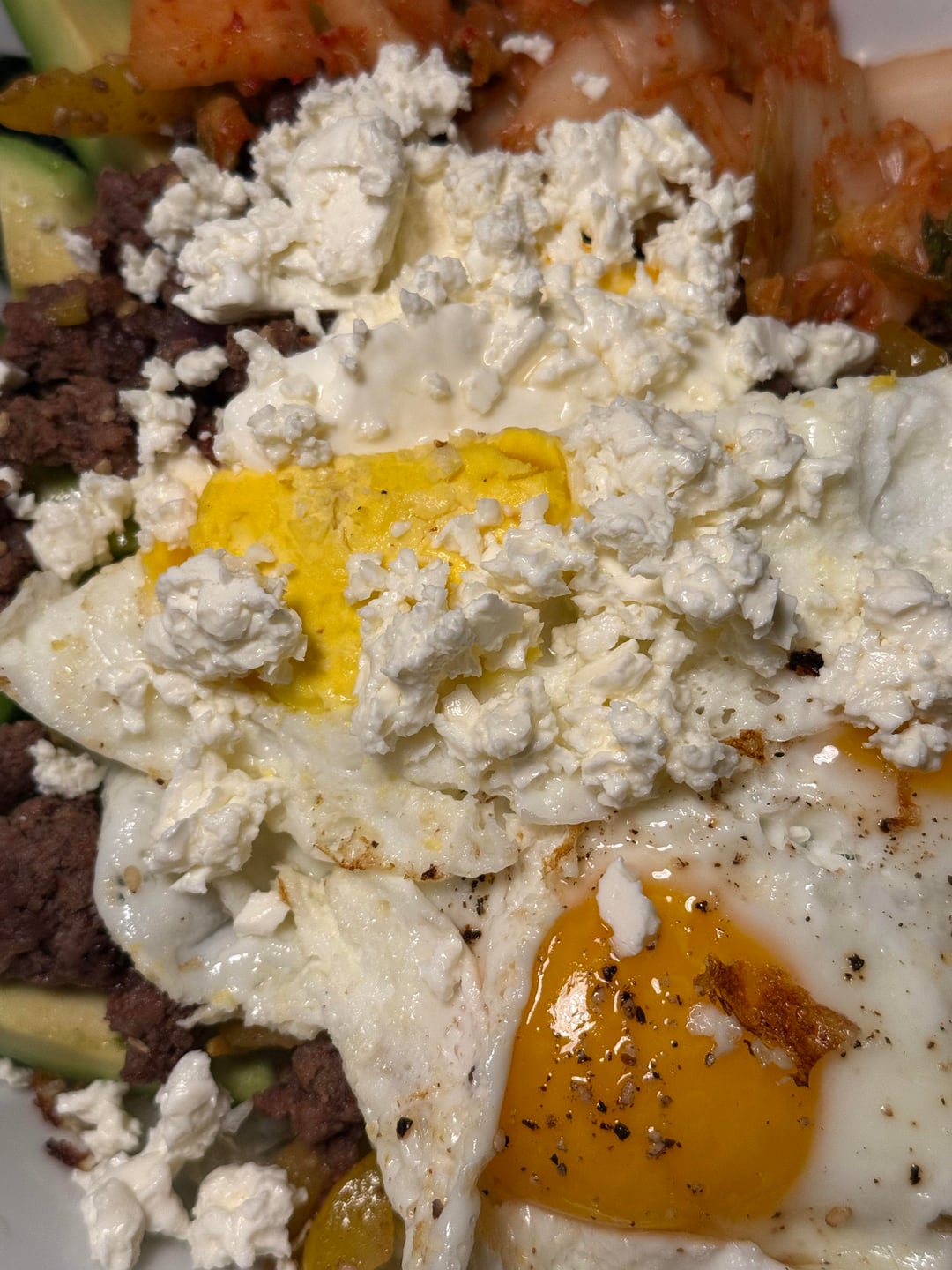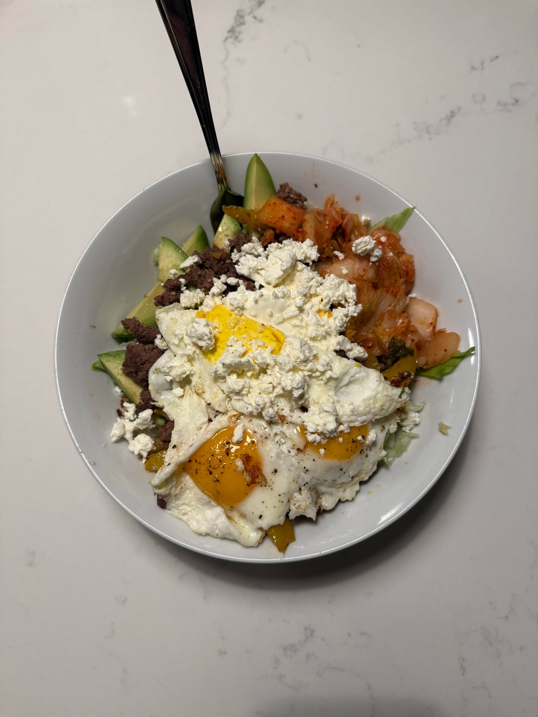 Korean fusion: ground beef, kimchi, avocado, fried eggs & fetaby RealistMind 1 Comment cooksmartr 4 months ago Interesting mix. Kimchi and avocado together? That’s a bold move but I respect it. 👌