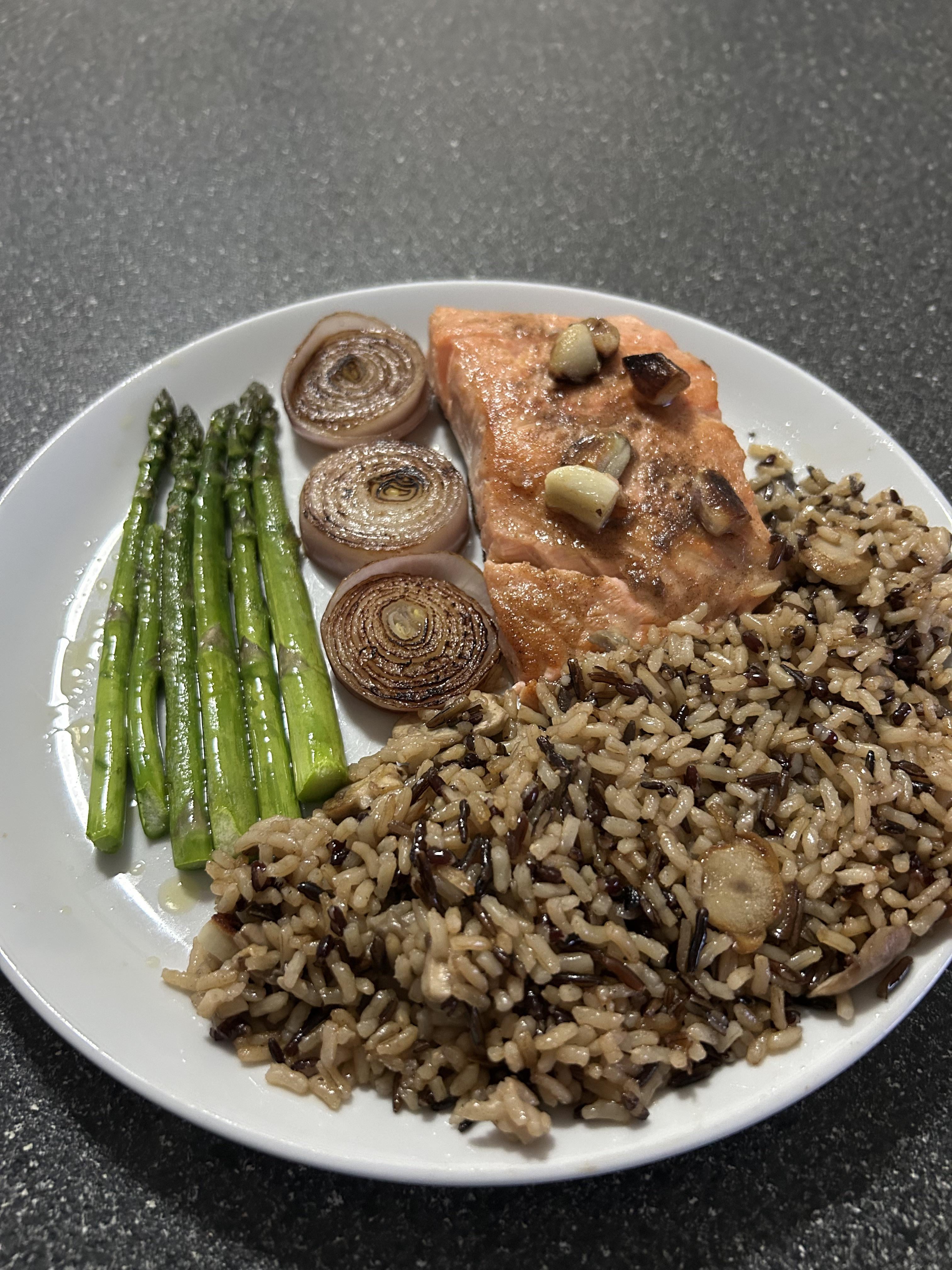 1/2 packet of wild rice mixed with chopped up portabello mushroom AsparagusChopped red onion rings Fillet of salmon seasoned with salt, pepper, garlic and olive oilAll cooked in one pan 🤓by NeatRecord4287 4 Comments [deleted] 1 month ago [deleted] Shiron10 1 month ago Looks delicious 😋 revolvingdepression 1 month ago looks phenomenal! absolutely stunning Dense_Ad_3756 1 month ago Looks awesome, I personally dont like wild rice but it’s good for you i’ve heard.