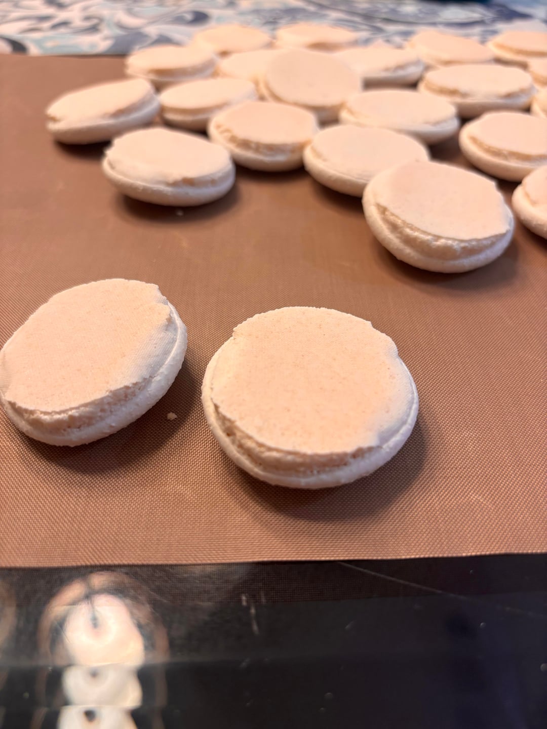 I've been baking macarons for about 3 months now and I just got some new teflon mats, and since i've been using them, all my macarons only have feet on 2 sides. I am not sure how or why this happens, but I think it is because the teflon mats are too nonstick? I've used teflon before and they turn out perfect, but when I use these mats they are not exactly lopsided. Just wondering if its because of the teflon mats. Just to add, right after I take them out of the oven and transfer them to a table to dry, all the macs just slide off their spot.