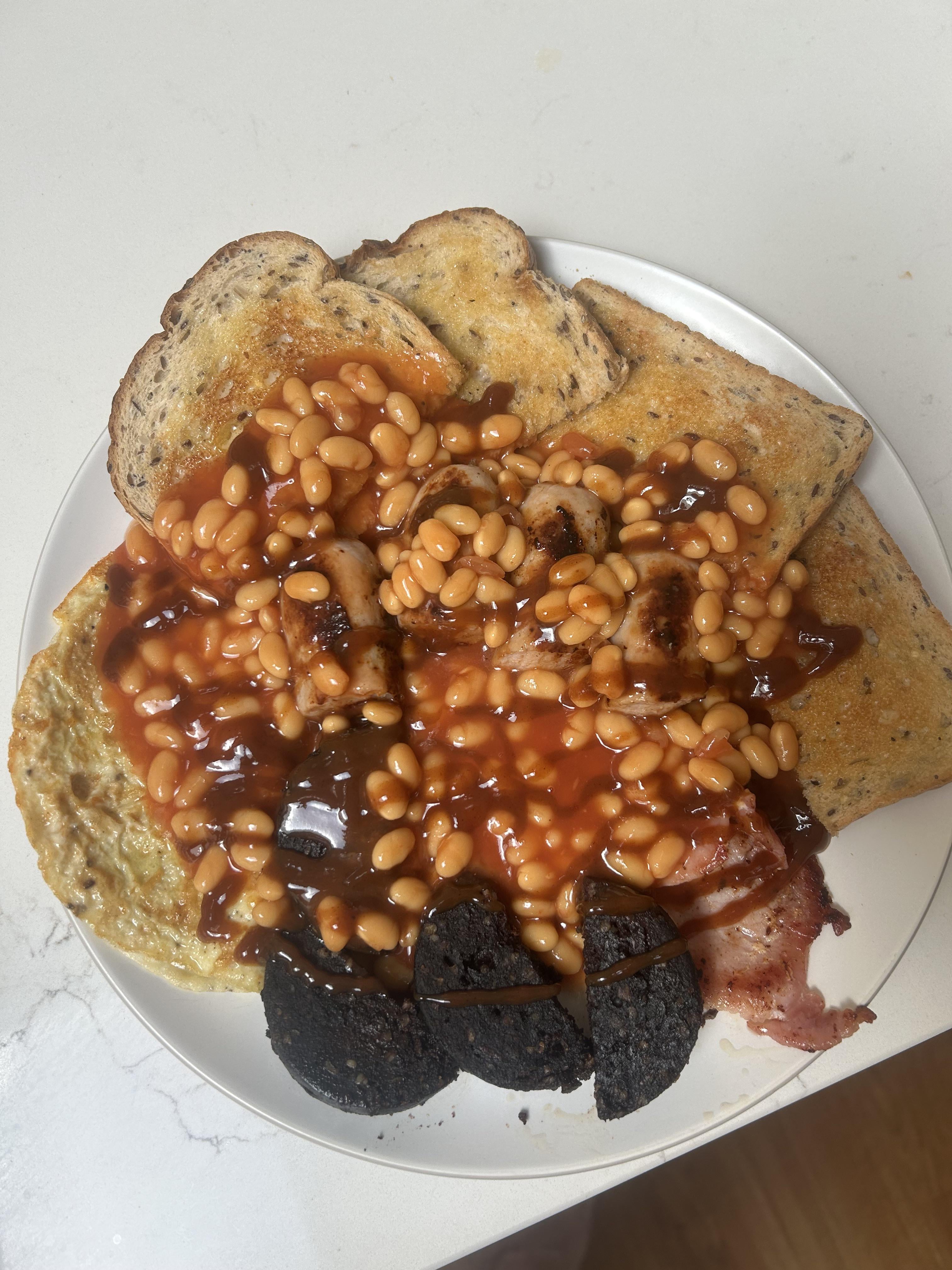 2 x buttered toast 2 x sausages 2 x bacon 2 x black pudding 1 egg omelette Half can of beans Drizzled HP all overby AlexMW88 Dining and Cooking