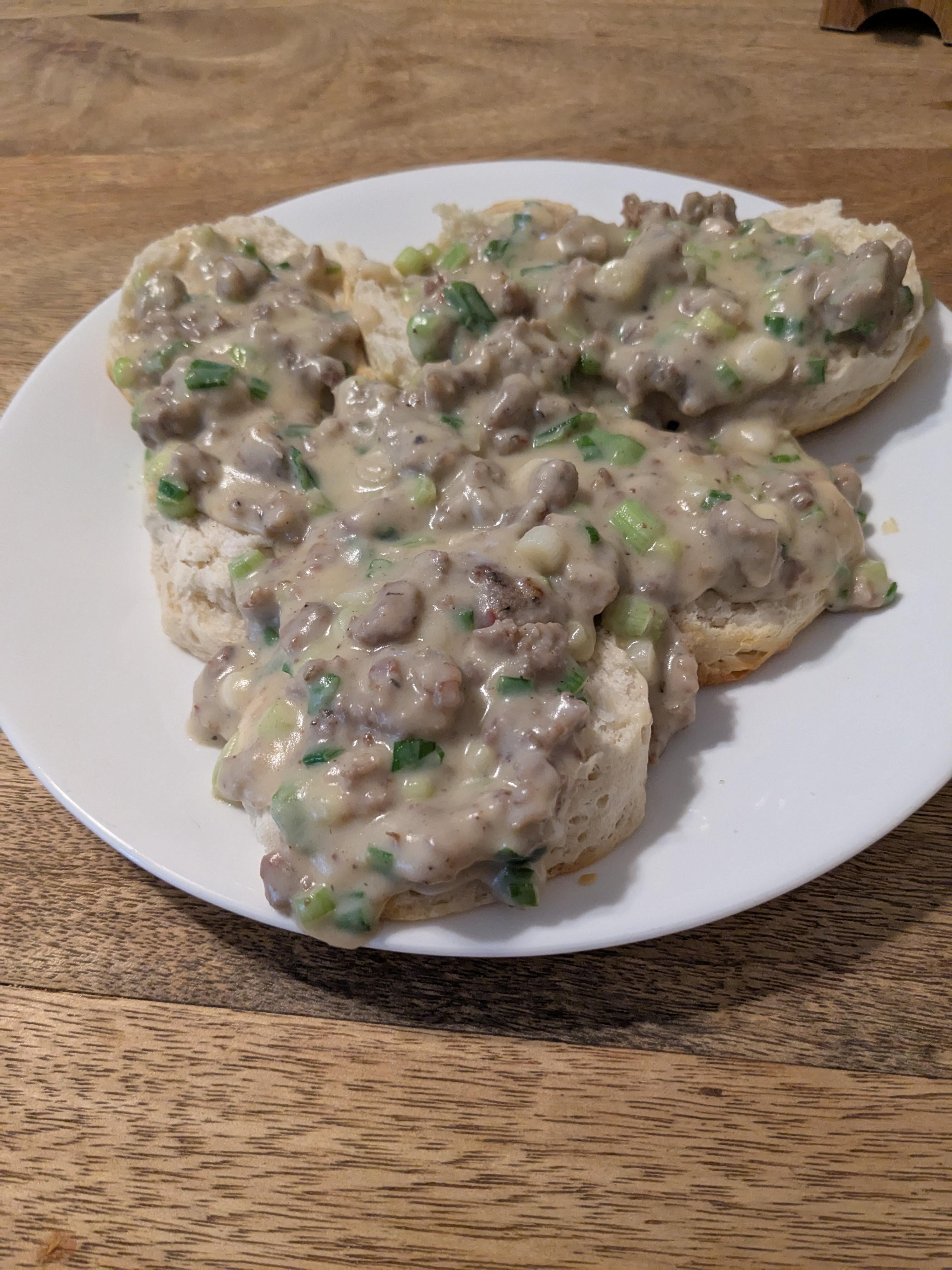 Once you try biscuits and gravy with green onions, it doesn’t ever taste right without it again.