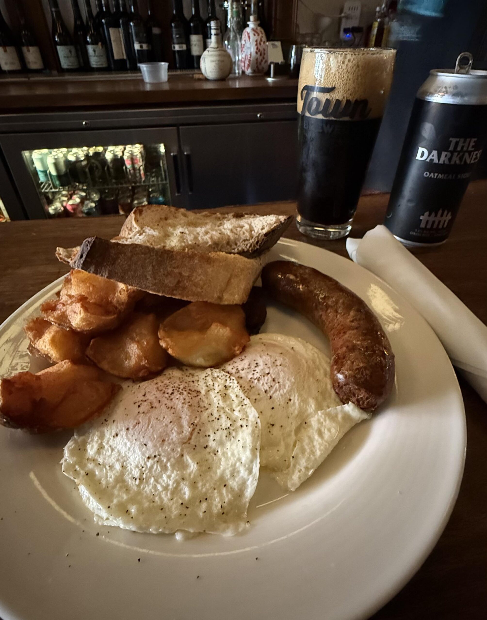 Nice. A relaxing tavern breakfast. Sausage looks perfectly crispy. Eggs appear “dippable”. Enjoy.