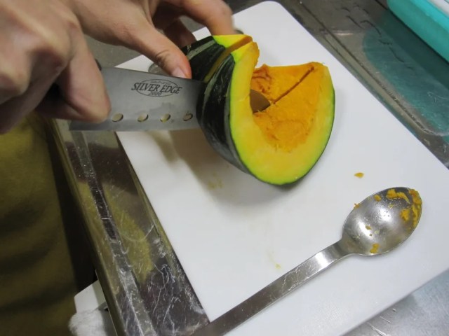 ▼ Krispy Kreme’s new donut is also orange, while kabocha (like this one we sliced up when making our Halloween jack-o’-lantern nikuman steamed buns) are green on the outside.