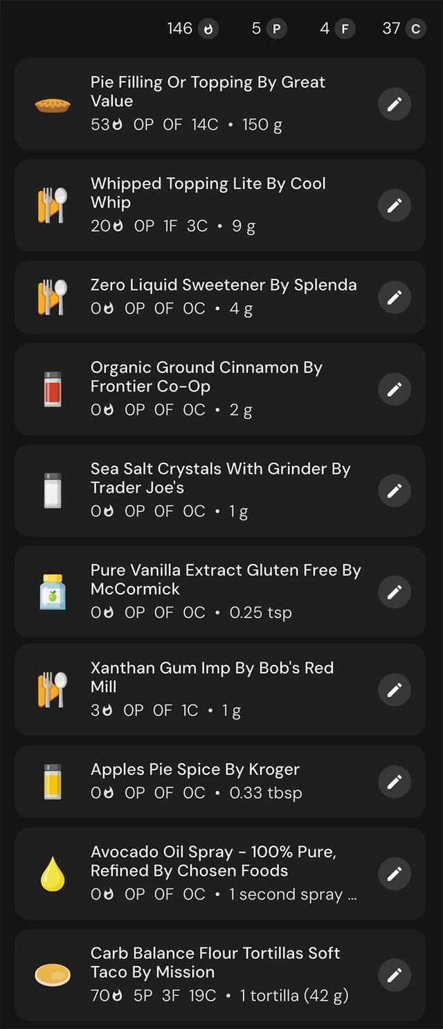 • 1/8 tsp each: McCormick Pure Vanilla Extract, Bob’s Red Mill Xanthan Gum, Kroger Apple Pie Spice