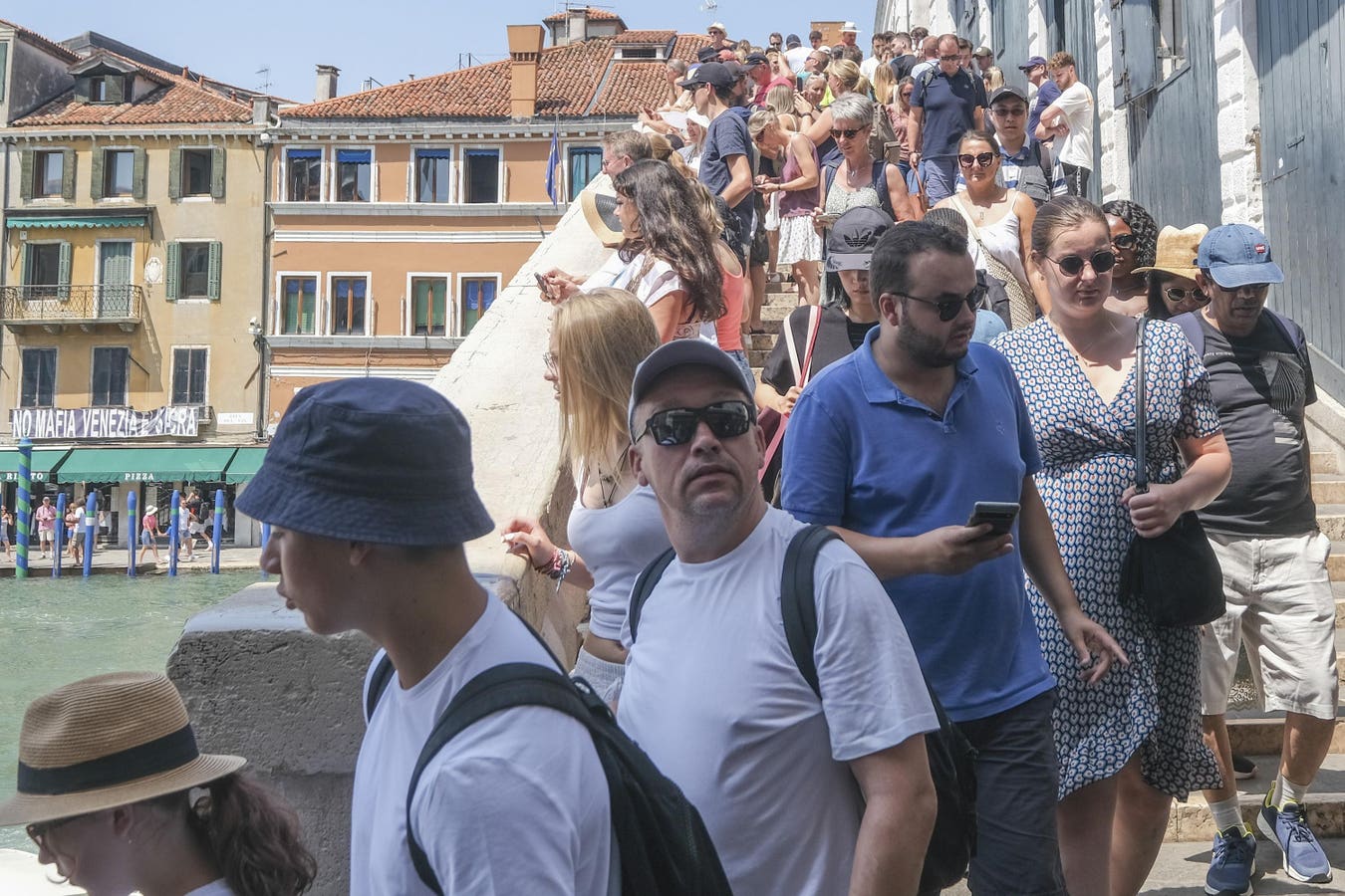 VENICE, ITALY – AUGUST 02: Tourists crowd the area near the Rialto Bridge on August 02, 2023 in Venice, Italy. UNESCO officials have included Venice and its lagoon to the list of world heritage in danger to review, along with Ukraine’s Kyiv, and Lviv. The UN cultural agency deems Italy not effective in protecting Venice from mass tourism and extreme weather conditions. (Photo by Stefano Mazzola/Getty Images)