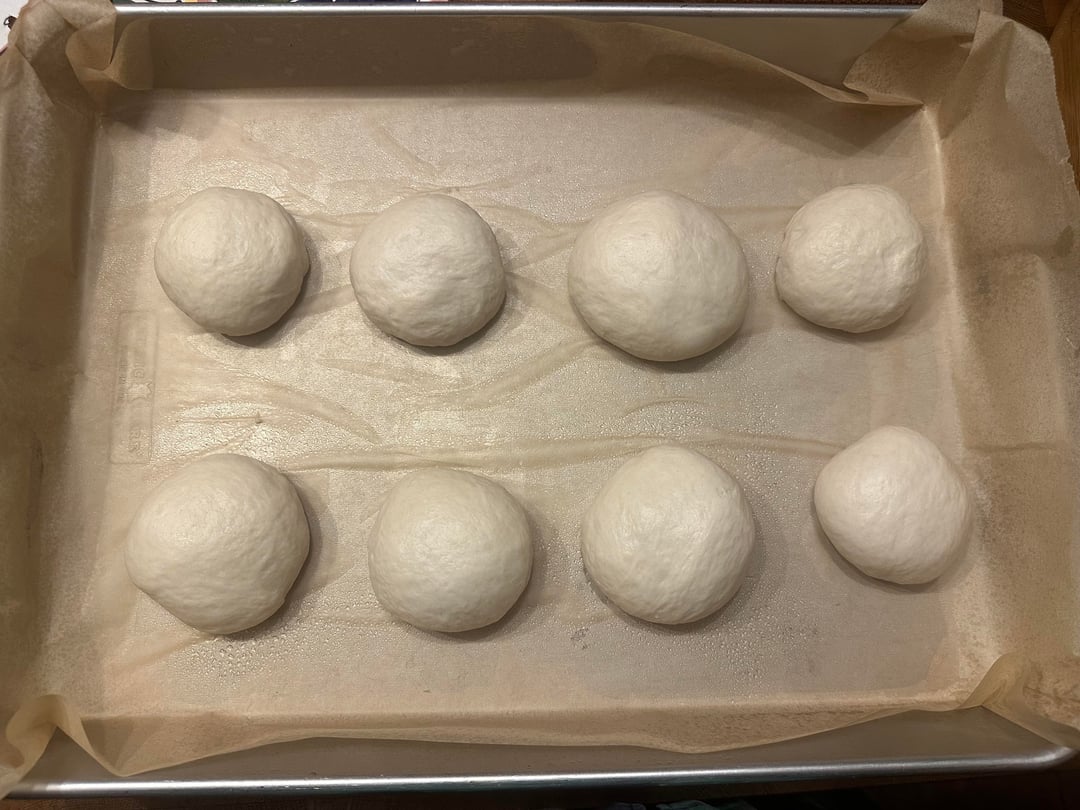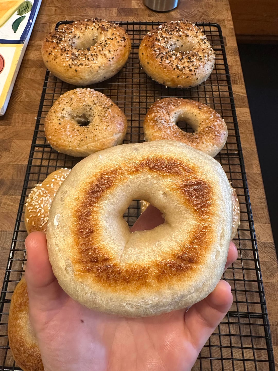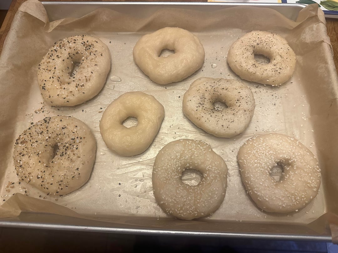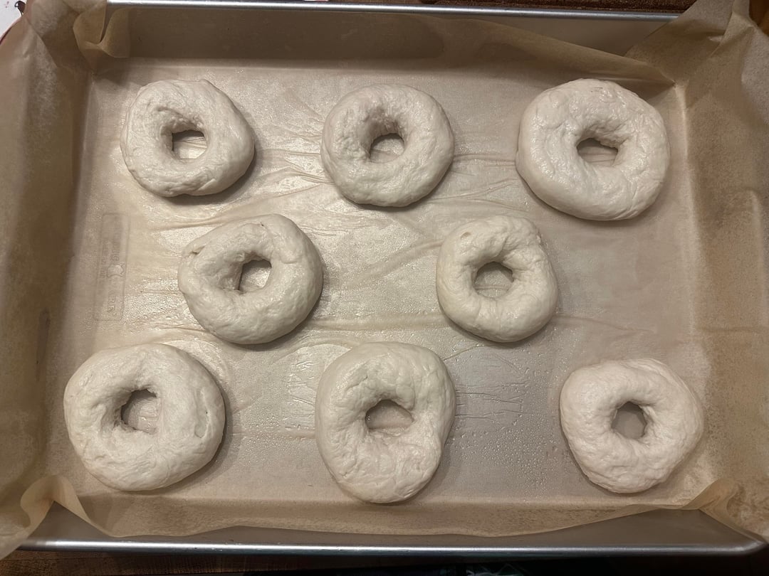 Fed my sourdough at 7 am ish (We’d) and then made the dough around 1:30 pm , proofed on the counter until it had doubled at about 9:30 pm. Divided, rolled, rested, made the holes, then into the fridge over night.