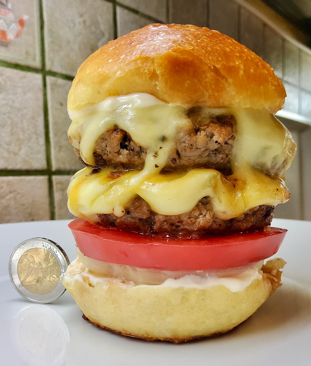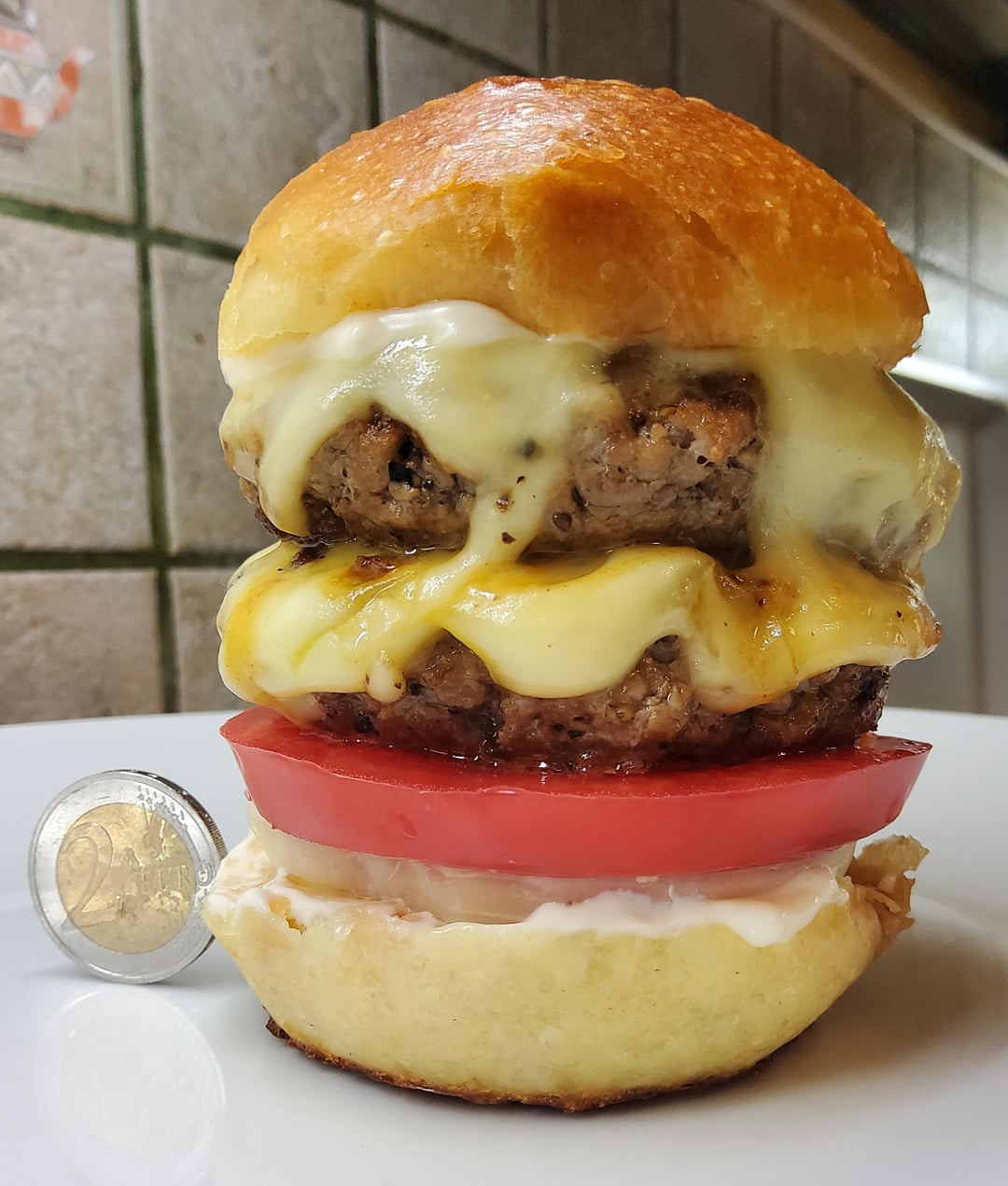 Inside we have two beef patties (2oz.each), a slice of yellow onion, a fresh tomato slice, gouda, mayonnaise, salt and cracked black pepper.