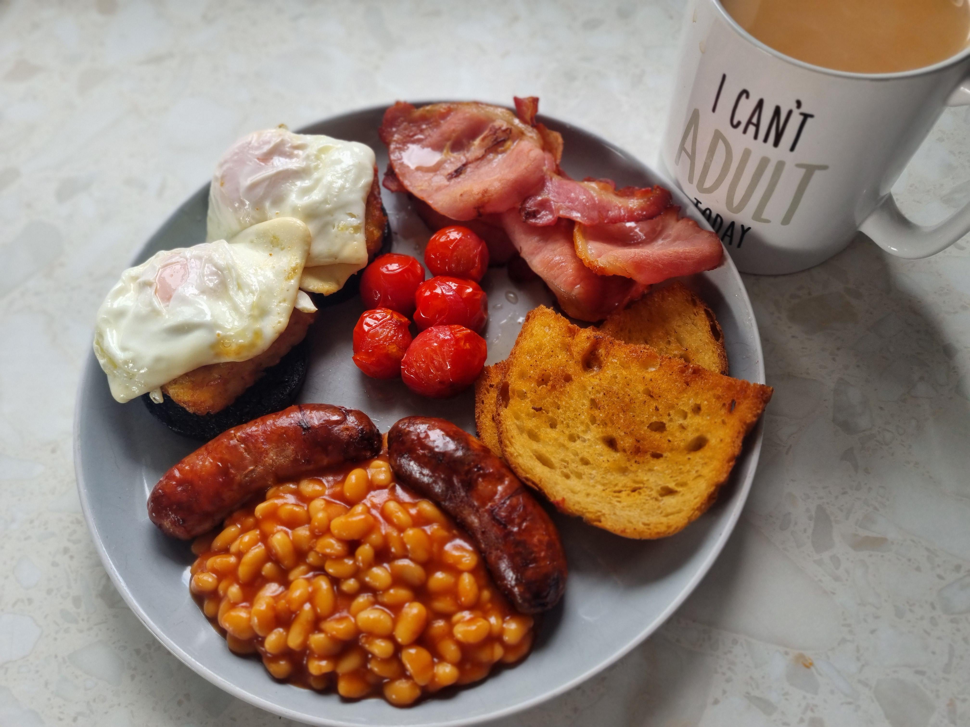 We've got some branston beans, m&s standard pork sausage, fried cherry tomatos, a fried slice of white sourdough bread halved, slightly too much bacon, and two towers of macsweens black pudding with a hash brown and a fried egg on top – runny yolks, pierce those babies and let the yolk cover the tower. Fall asleep in front of the telly.