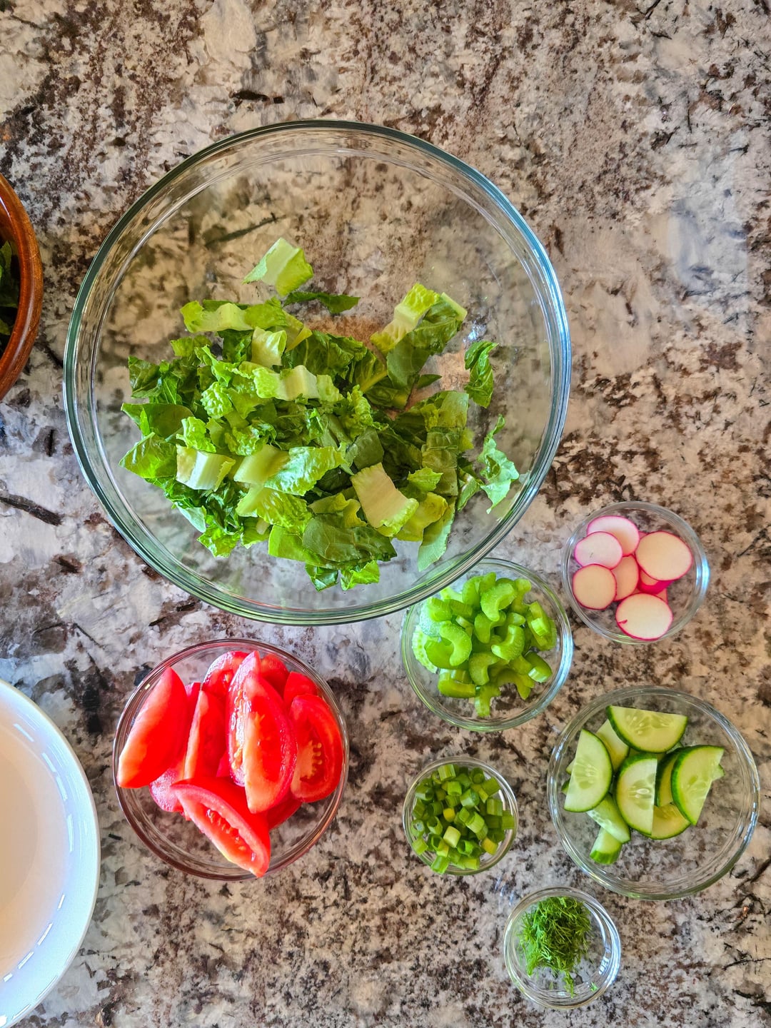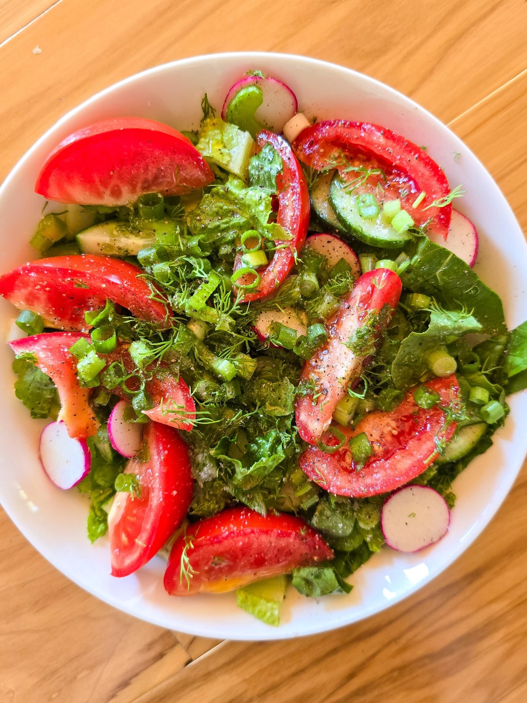 Dinner tonight: fettuccine tossed with mussels and walnut pesto, plus a BIG side salad. I set up a little “salad bar” at the table. My husband usually sticks to greens and tomatoes, while I load mine up with cucumber, radish, green onion, dill, and finish it with lemon juice, olive oil, salt, and pepper.