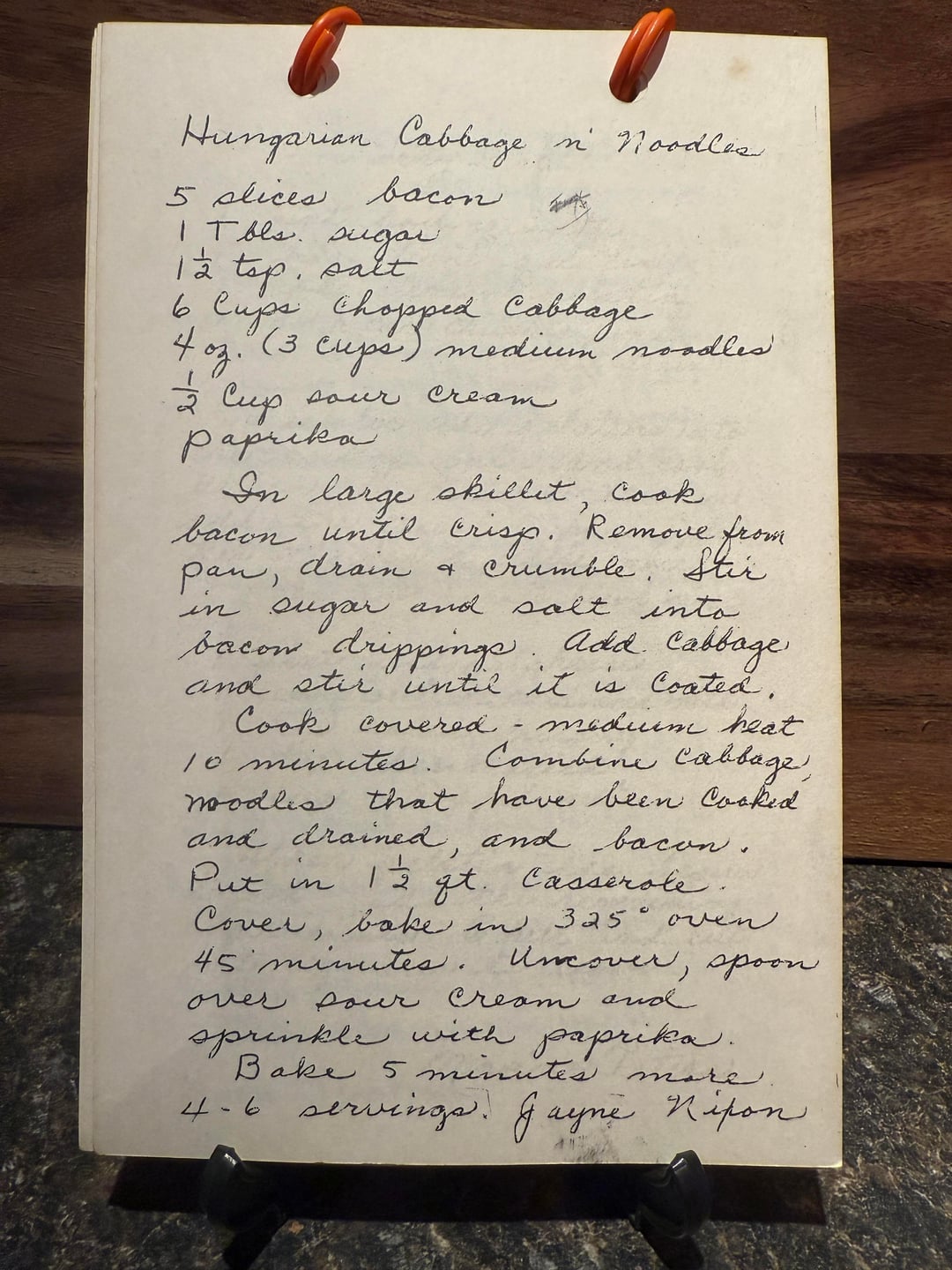 Cook covered — medium heat 10 minutes. Combine cabbage, noodles that have been cooked and drained, and bacon. Put in 1½ qt. casserole. Cover, bake in 325° oven 45 minutes. Uncover, spoon