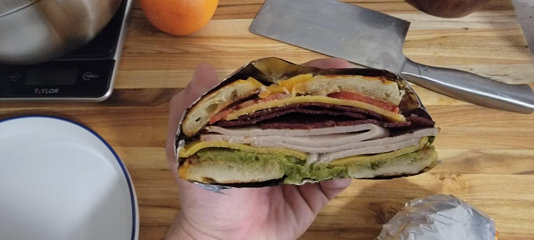 Mortadella, turkey, smoked gouda, homemade avocado spread, Philly garlic and herb cream cheese, some sliced tomatoes on an asiago bagel.by JLev1992 1 Comment TheEpicGnaar 3 weeks ago What’s up with mortadella? Never had it, and it looks like Bologna. Someone make me want to eat it please?